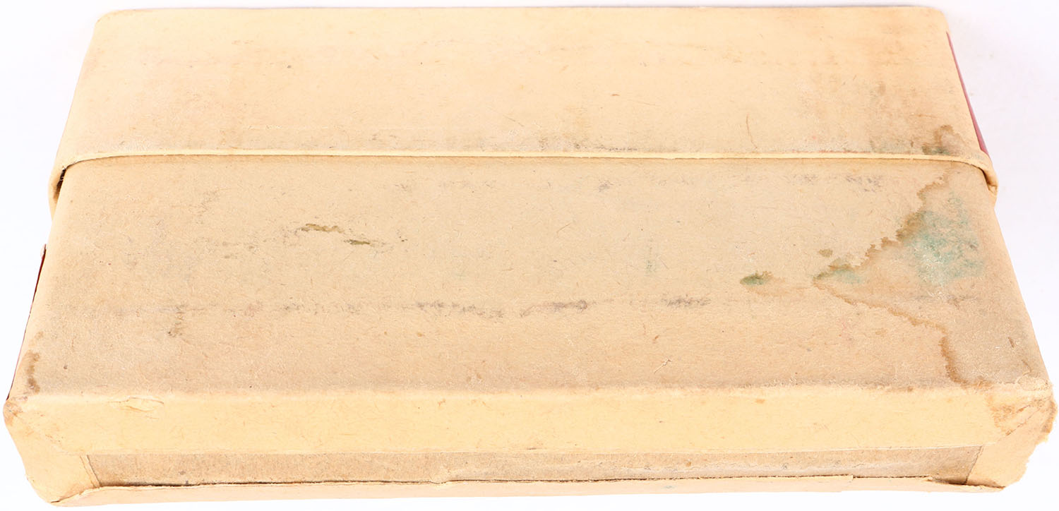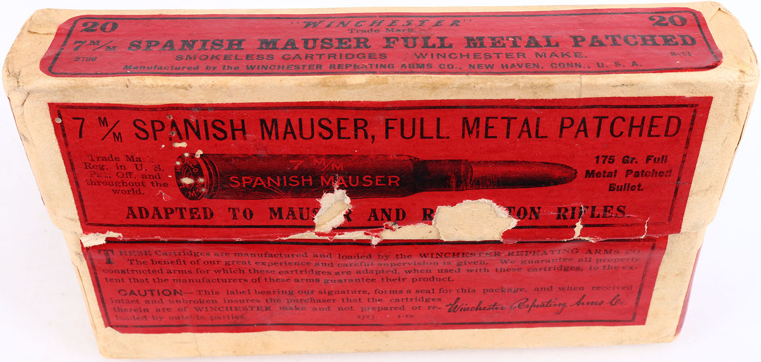 Winchester, .7mm Spanish Mauser, 175 Grain Bullet, Full, 2pc. Buff box with red labels, box has age soiling, scuffing to labels, ammo is very good. Grade: Very Good ++ - Value: 40 to 100