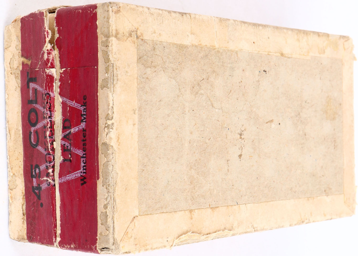 Winchester, .45 Colt, Smokeless Powder, Full, 2pc. Buff box with slightly faded purple labels, box has 1 seam split and scuffing, some scuffing to labels, Ammo is excellent. Grade: Very Good ++ - Value: 100 to 500