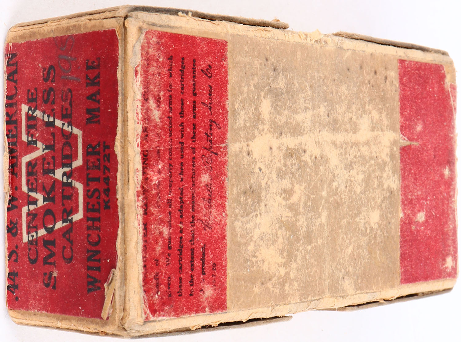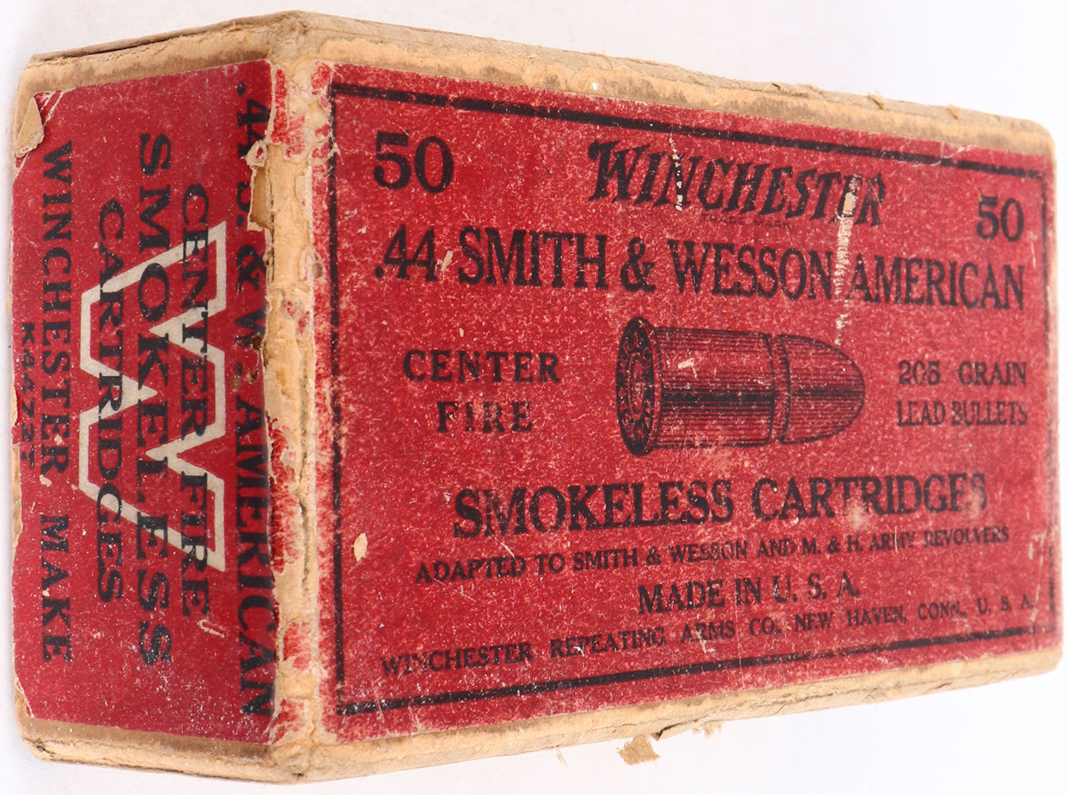 Winchester, .44 Smith & Wesson, Smokeless Powder, Partial 18 win rounds and 32 Rem rounds, 2pc. Buff box with red label, box has scuffing, some scuffing to labels, Ammo is fair. Grade: Very Good + - Value: 50 to 400