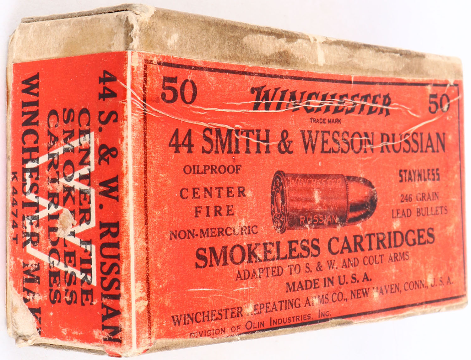 Winchester, .44 Smith & Wesson, Smokeless Powder, FULL, 2pc. Buff box with red label, box has scuffing, some scuffing to labels, Ammo is excellent. Grade: Very Good ++ - Value: 100 to 500