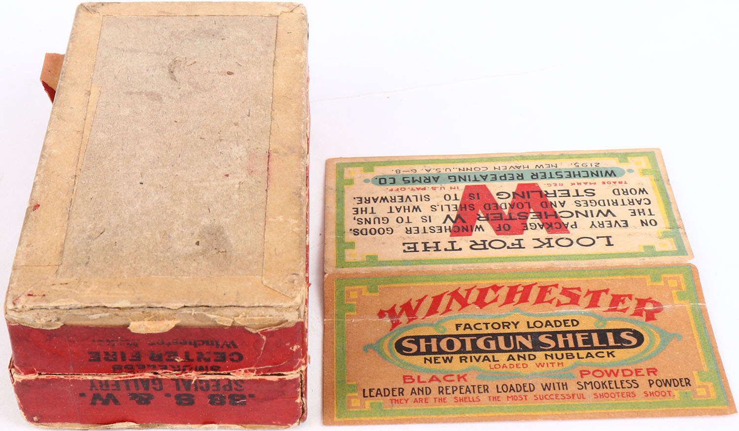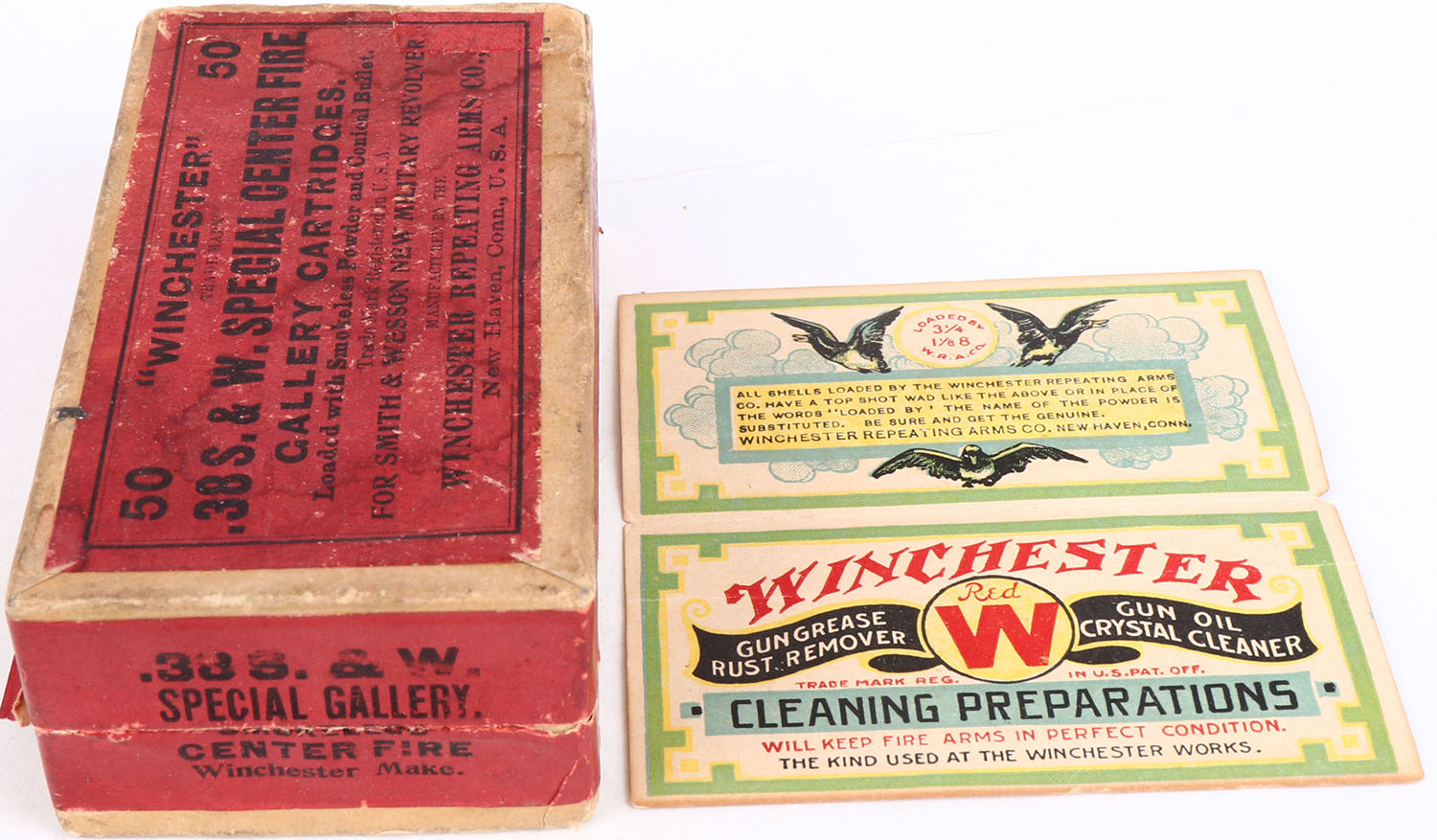 Winchester, .38 Smith & Wesson Special, Gallery Cartridges, Full - with insert, 2pc. Buff box with red top & side sealing labels, box is solid with very good to excellent color, very minor age soiling & staining on top, seam splits to right end of top that have been repaired, some shelf wear, labels are 90% intact, insert is very good to excellent, ammo is excellent. Grade: Very Good ++ - Value: 50 to 150