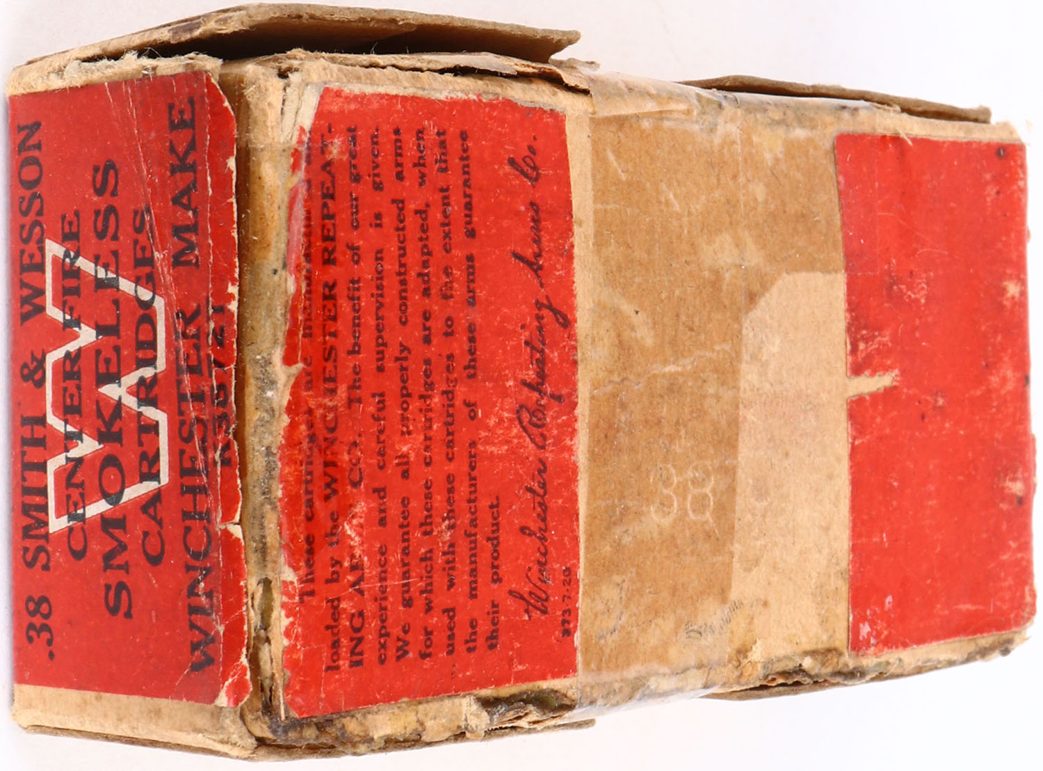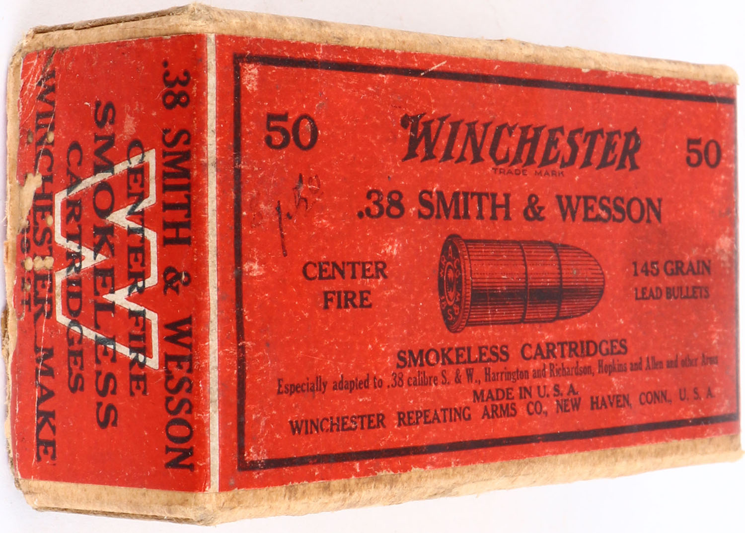 Winchester, .38 Smith & Wesson, 145 Grain Lead Bullets, Full of Mixed H/S, 2pc. Buff box with red wraparound label, bottom has 3 edges that are seam split, tape on bottom, some edge & corner wear, minor shelf wear, top has been written on, ammo is very good to excellent. Grade: Good + - Value: 10 to 40
