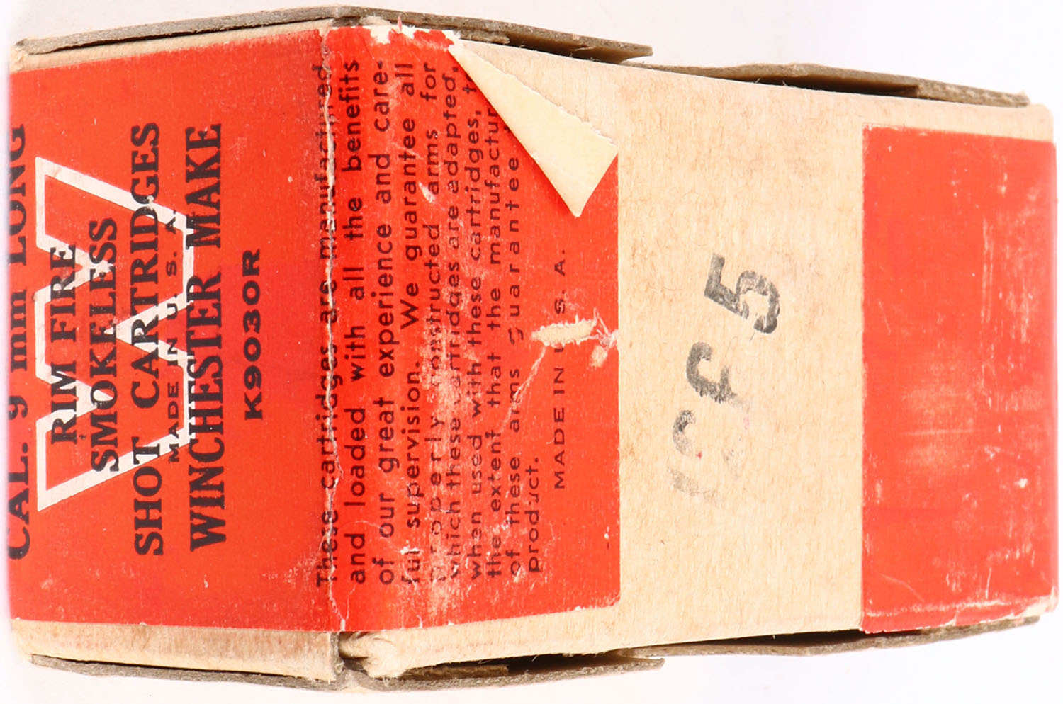 Winchester, 9mm Long Shot Cartridges, Rim Fire, FULL & SEALED, 2pc. Buff box with red wraparound label, box is solid with excellent to minty color, very minor shelf wear, edges are crisp, corners are mostly sharp, labels are intact. Grade: Excellent ++ - Value: 100 to 300