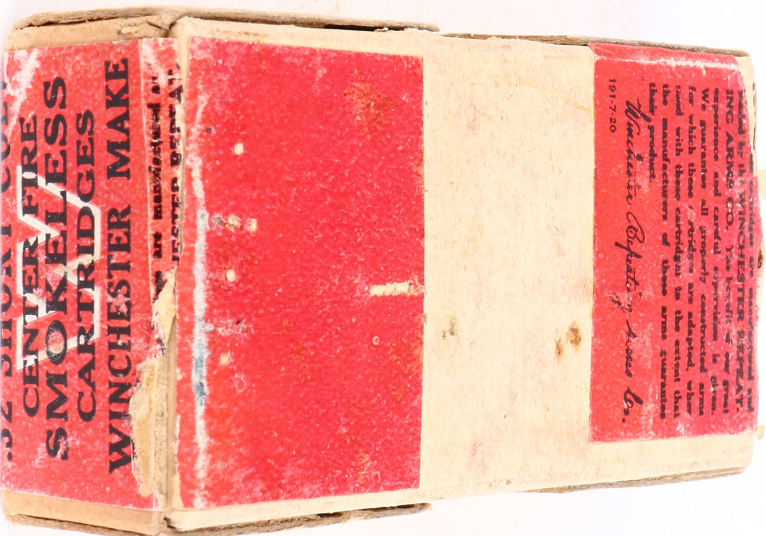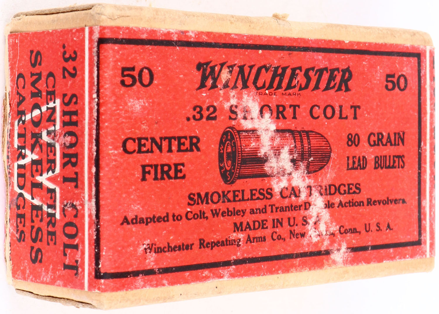 Winchester, .32 Short Colt, 80 Grain Lead Bullets, Full, 2pc. Buff box with red wraparound label, box is solid with excellent color, shelf wear, very minor corner wear, edges are mostly crisp, label is intact, ammo is very good. Grade: Excellent - Value: 30 to 90