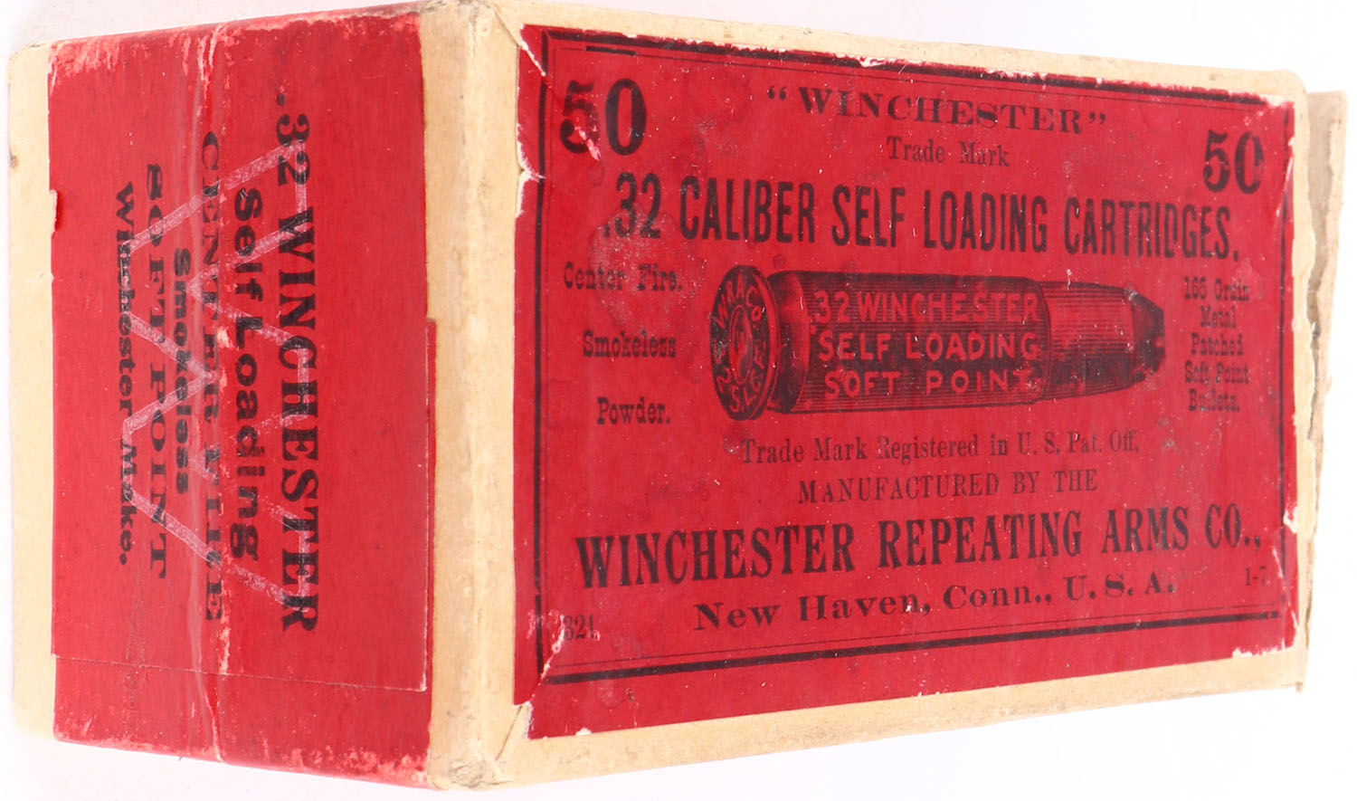 Winchester, .32 Winchester Self Loading, 165 Grain Metal Patched Soft Point Bullets, FULL & SEALED, 2pc. Buff box with red top & side sealing labels, box is solid with excellent color, vertical seam split to back right corner of lid, seam split to bottom right edge, minor corner wear, edges are mostly crisp, labels are intact. Grade: Very Good + - Value: 50 to 200