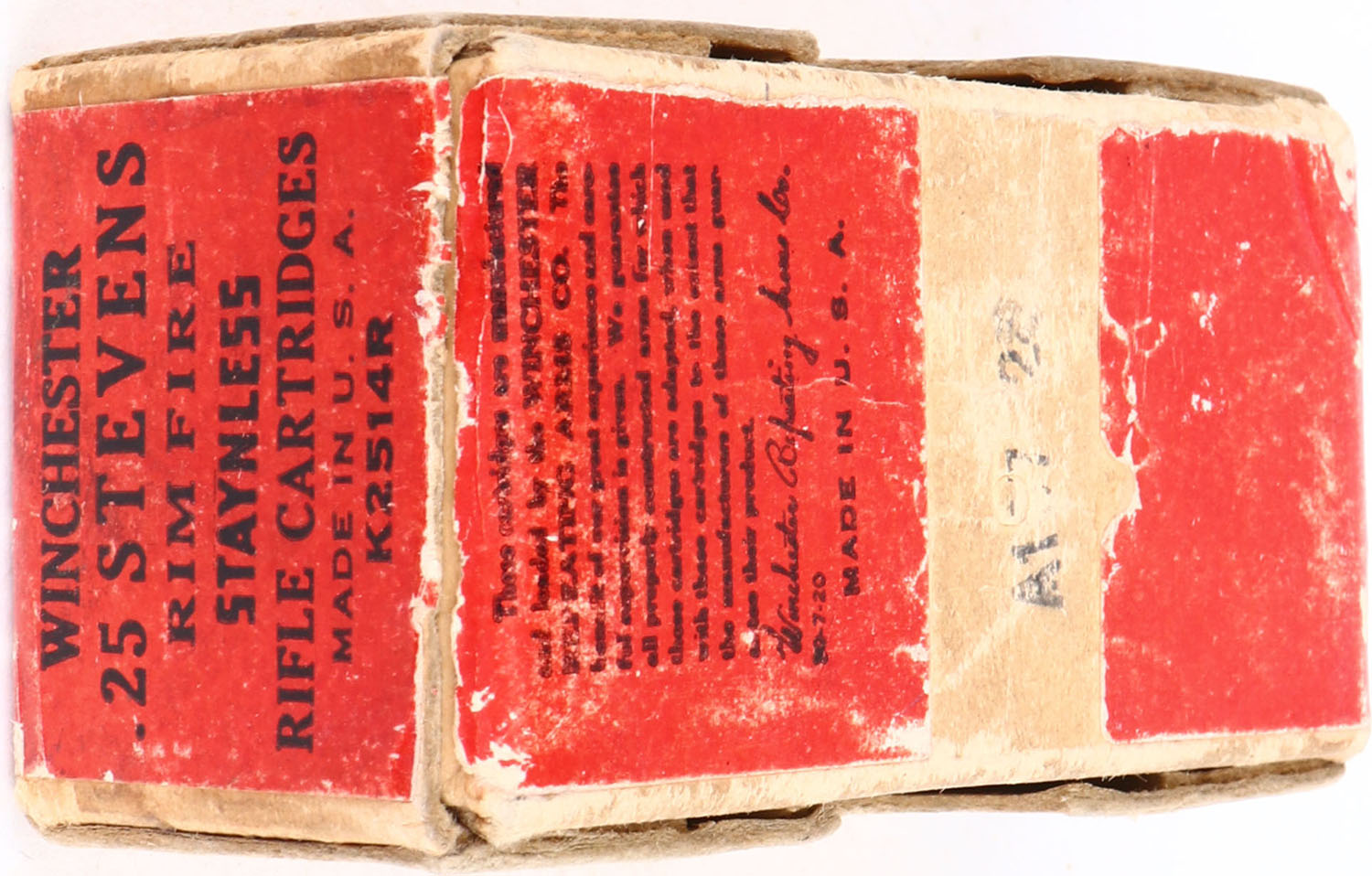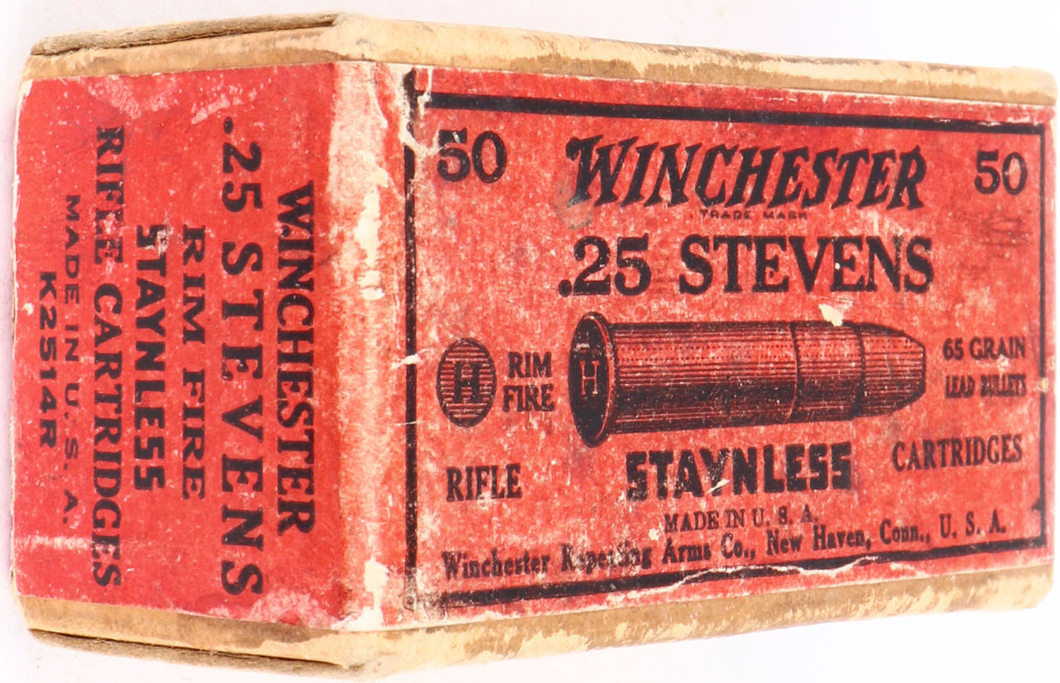 Winchester, Staynless, .25 Stevens Rim Fire, 65 Gain Lead Bullets, Full, 2pc. Buff box with red wraparound label, box is solid with very good color, minor age soiling, some shelf & corner wear, minor edge wear, some staining to front side, back side has been written on, label is intact, ammo is excellent. Grade: Excellent + - Value: 50 to 150