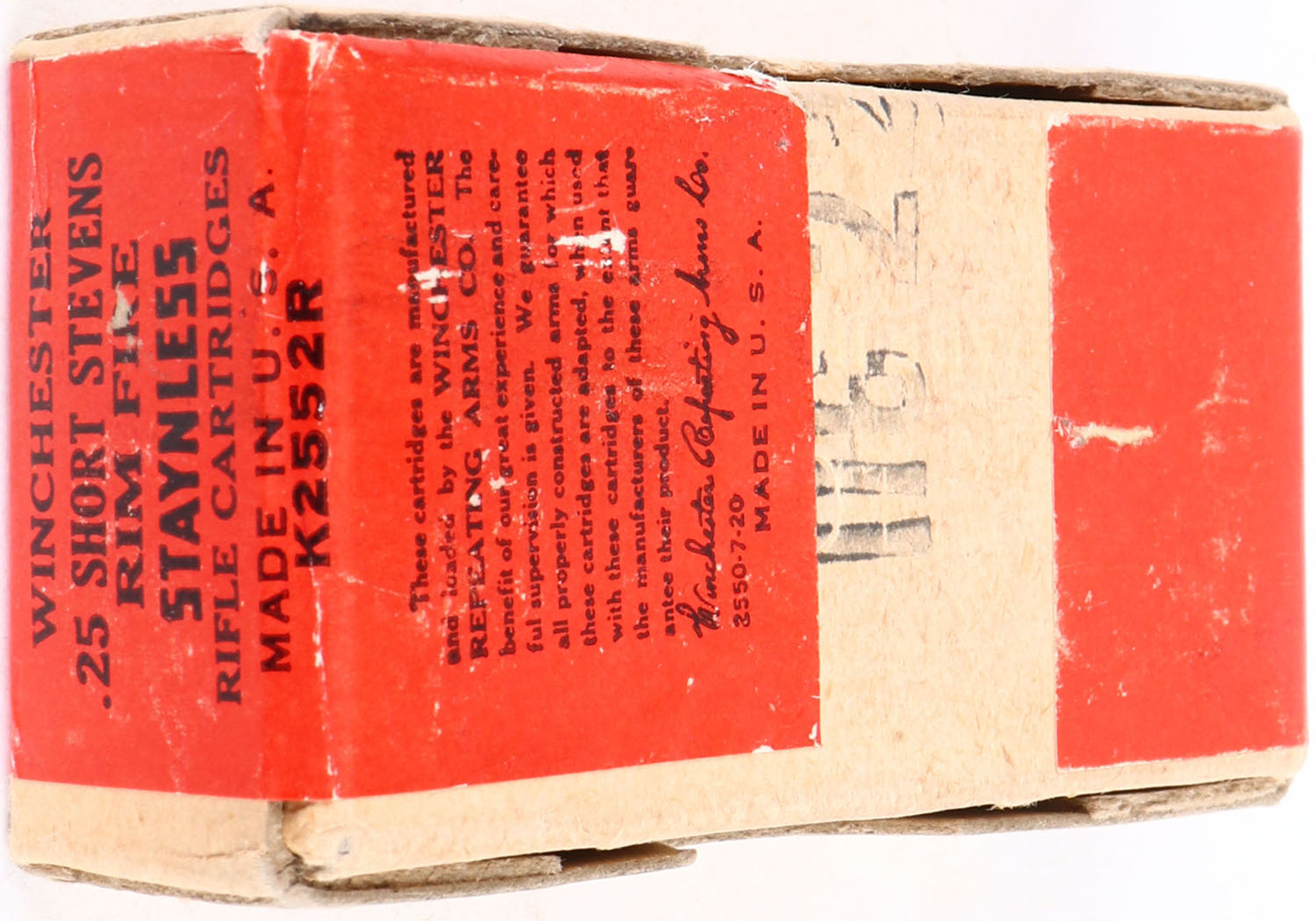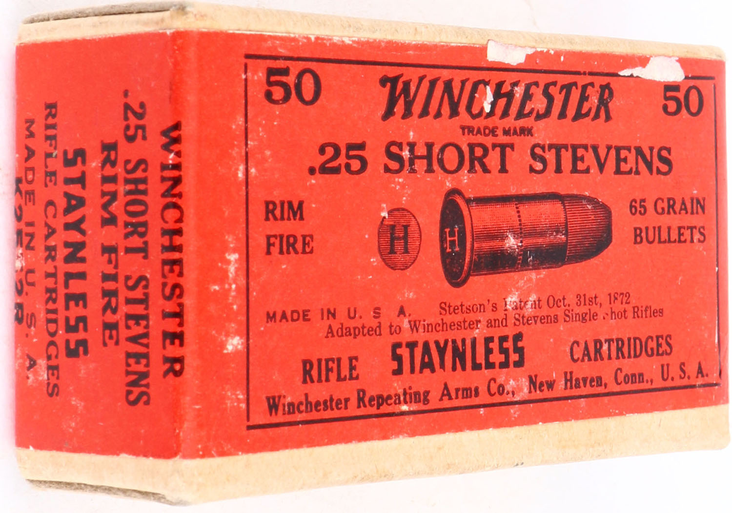 Winchester, .25 Short Stevens Rim Fire, Staynless, FULL & SEALED, 2pc. Buff box with red wraparound label, box is solid with minty color, very minor shelf & corner wear, edges are crisp, labels are intact. Grade: Excellent ++ - Value: 50 to 150