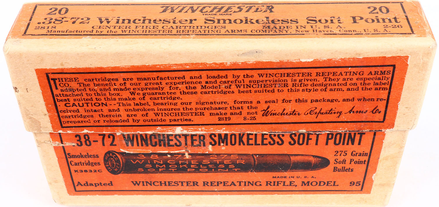 Winchester, .38-72 Winchester, Smokeless, 275 Grain Soft Point Bullets, Full of mixed Primers - All W.R.A.Co. H/S, 2pc. Buff box with orange labels, box is solid with excellent color, minor age soiling, very minor corner wear, edges are mostly crisp, back has been written on, labels are intact, ammo is excellent. Grade: Excellent - Value: 100 to 300