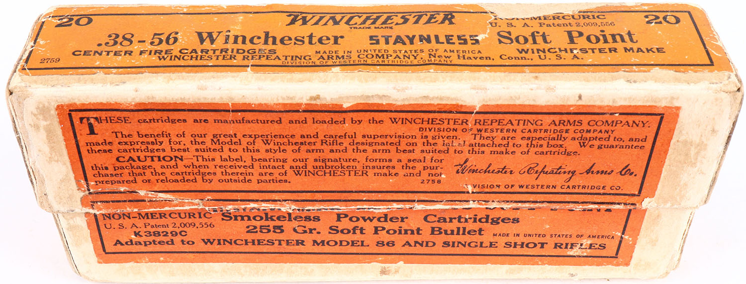 Winchester, Staynless, .38-56 Winchester, Soft Point, Full, 2pc. Buff box with orange labels, box is solid with excellent color, some age soiling & shelf wear, some edge & corner wear, labels are intact, ammo is excellent. Grade: Excellent - Value: 50 to 150