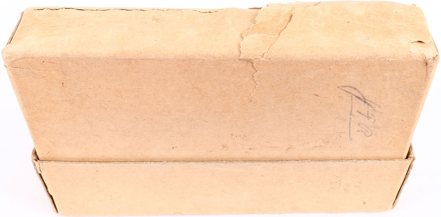 Winchester, .35 Winchester Model 1895, Smokeless, 250 Grain Soft Point Bullets, Full, 2pc. Buff box with excellent color, very minor age soiling & staining to front side, tear on bottom, very minor edge & corner wear, back has been written on, ammo is very good. Grade: Very Good ++ - Value: 50 to 150