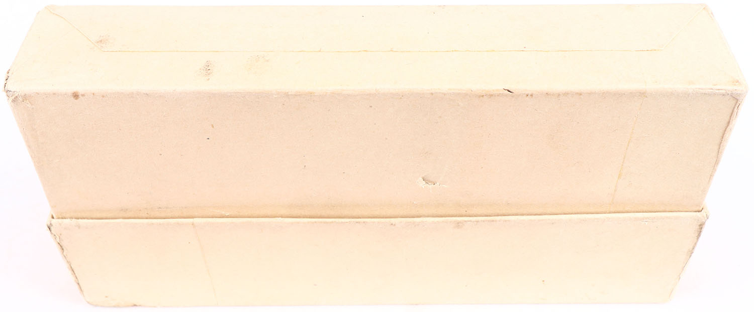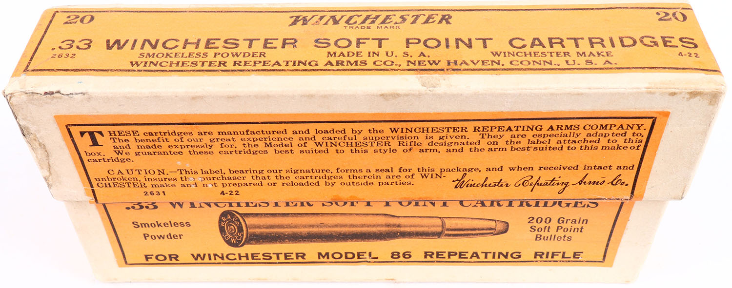 Winchester, .33 Winchester, Smokeless Powder, 200 Grain Soft Point Bullets, FULL & SEALED, 2pc. Buff box with orange labels, box is solid with excellent to minty color, only minor staining to top & front, some edge & corner wear, corners are mostly sharp, edges are mostly crisp, labels are intact. Grade: Excellent ++ - Value: 150 to 300