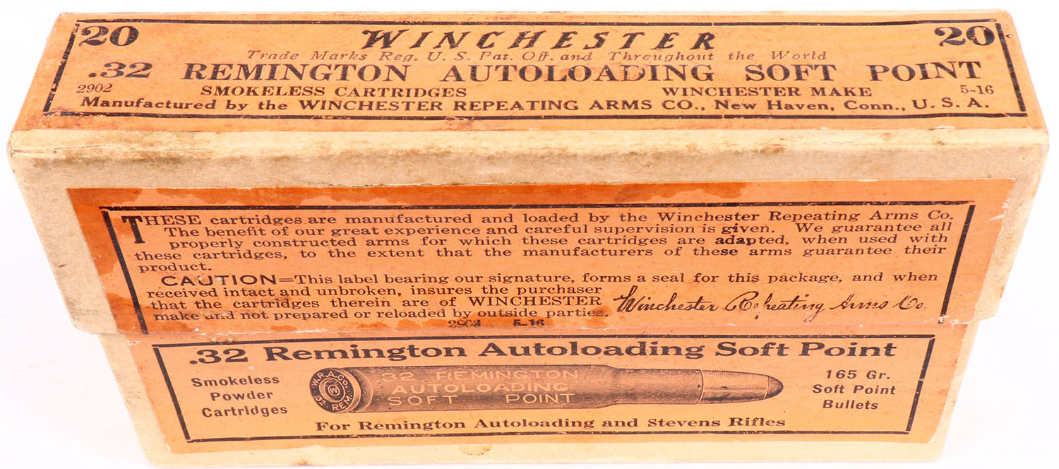 Winchester, .32 Remington Autoloading, Smokeless Powder, 165 Gr. Soft Point Bullets, Full, 2pc. Buff box with orange labels, box is solid with excellent color, very minor age soiling and staining to front & back, minor edge wear, very minor corner wear, labels are intact, ammo is excellent. Grade: Excellent + - Value: 40 to 120