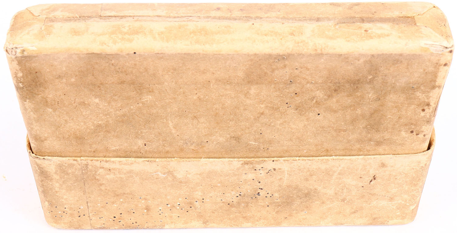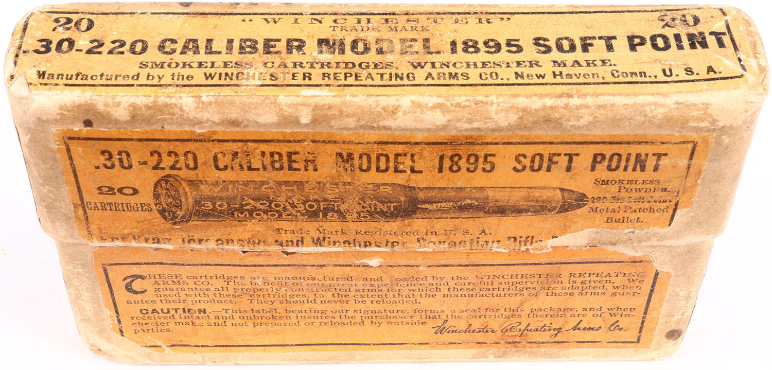 Winchester, .30-220, Model 1895, Smokeless Powder, 220 Grs. Soft Point Metal Patched Bullet, Full, 2pc. Buff box with orange labels, box is solid with very good color, some age soiling, & shelf wear, some edge & corner wear, spotting on back side, labels are intact, ammo is excellent. Grade: Very Good ++ - Value: 20 to 60