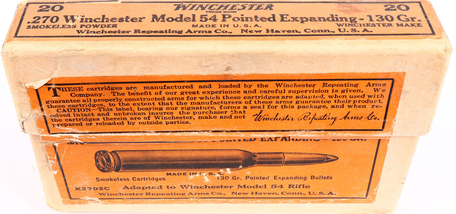 Winchester, .270 Winchester, Model 54, Smokeless Powder, 130 Gr. Pointed Expanding Bullets, Full, 2pc. Buff box with orange labels, box is solid with excellent color, minor age soiling & shelf wear, very minor corner wear, edges are mostly crisp, labels are intact, ammo is excellent. Grade: Excellent + - Value: 30 to 90