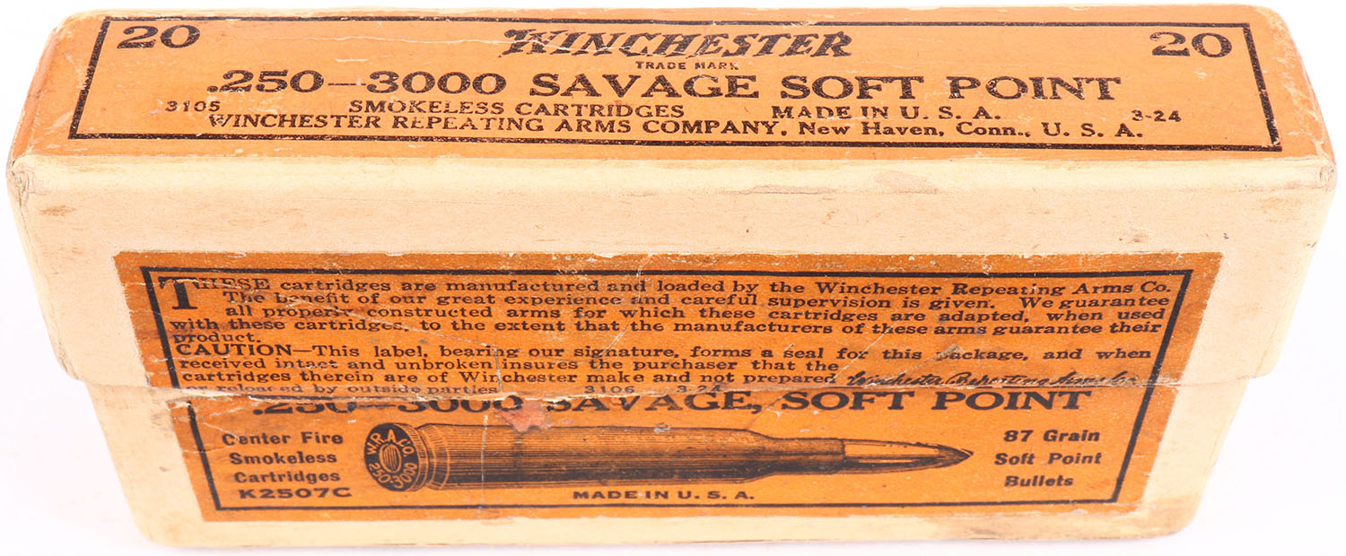 Winchester, .250-3000 Savage, Smokeless Powder, 87 Grain Soft Point Bullets, Full, 2pc. Buff box with orange labels, box is solid with excellent color, very minor age soiling, staining to front side & bottom, minor corner wear, edges are mostly crisp, labels are intact, ammo is excellent. Grade: Excellent - Value: 30 to 90