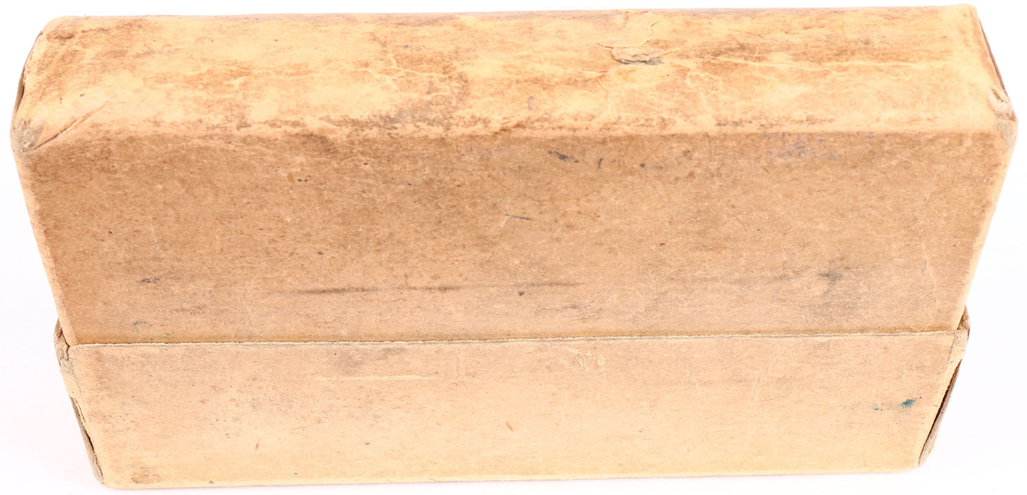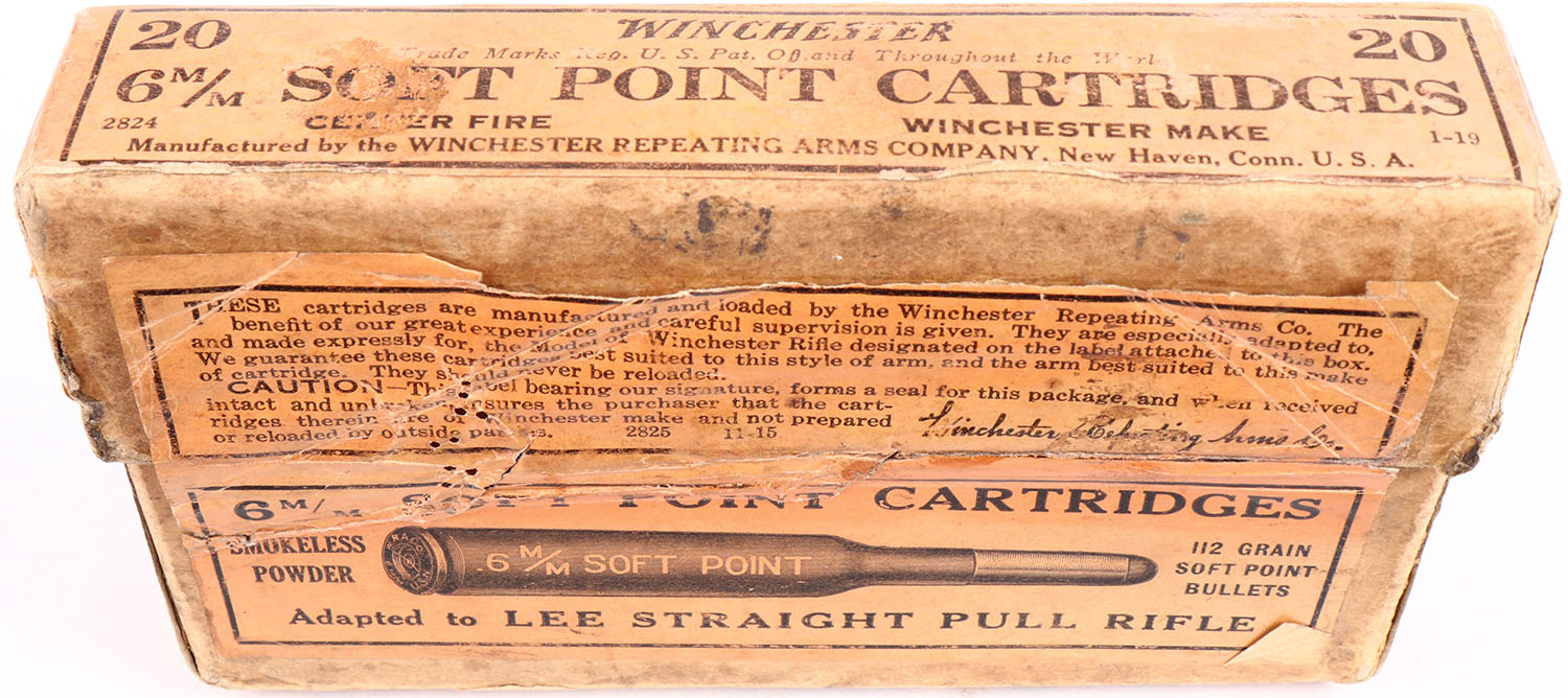 Winchester, 6mm, Adapted to Lee Straight Pull Rifle Smokeless Powder, 112 Grain Soft Point Bullets, Partial 17rds., 2pc. Buff box with orange labels, box is solid with very good color, small puncture on bottom, age soiling, some color fading & shelf wear, edge & corner wear, labels are intact, ammo is excellent. Grade: Very Good + - Value: 30 to 90