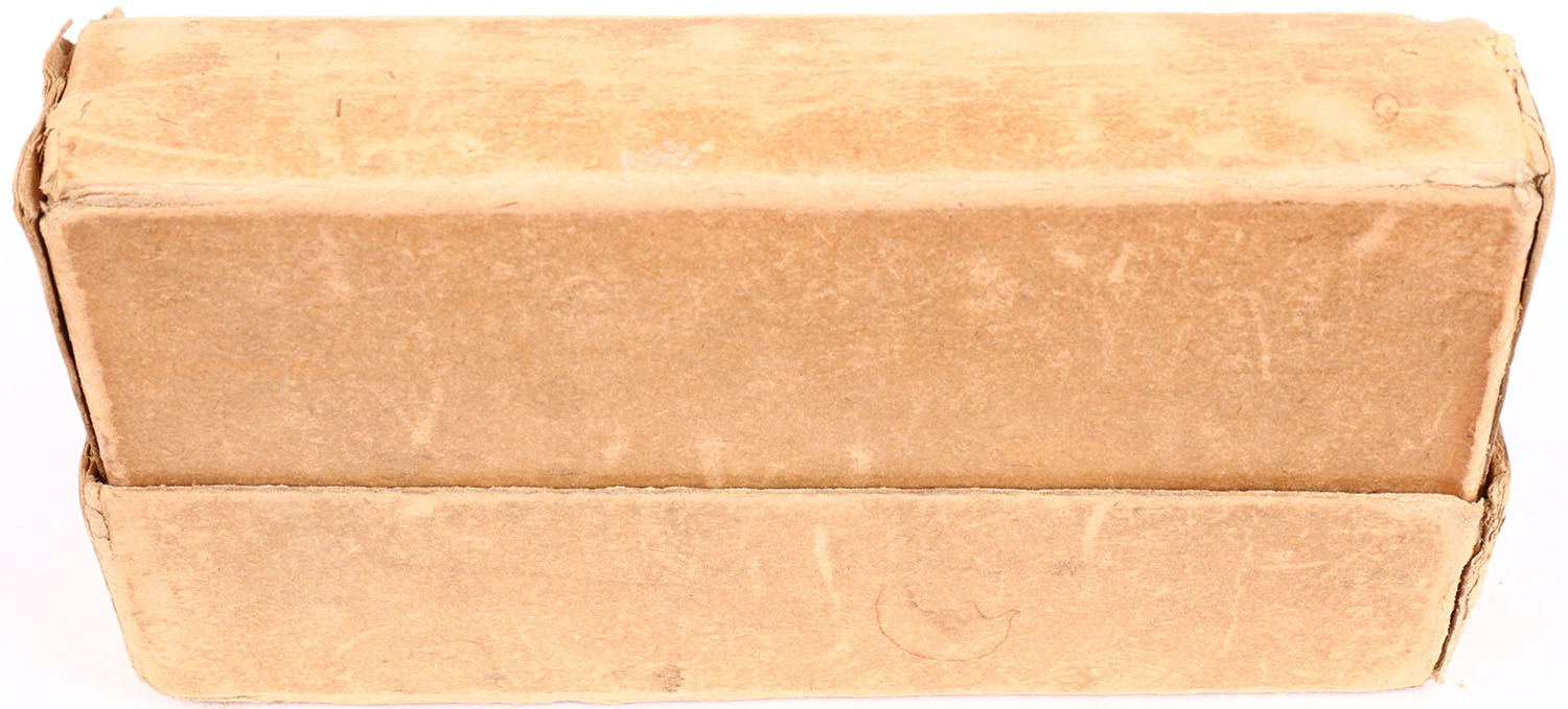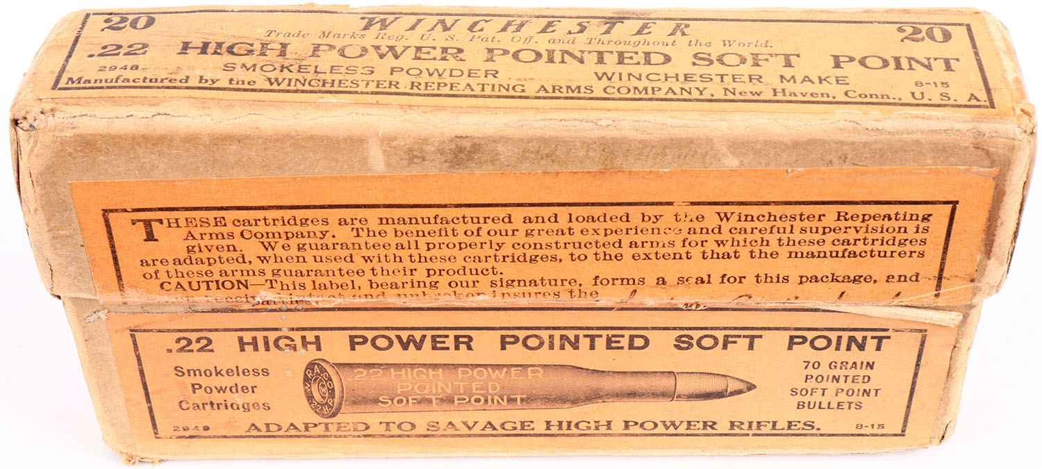 Winchester, .22 High Power, Smokeless Powder, 70 Grain Pointed Soft Point Bullets, Full, 2pc. Buff box with orange labels, box is solid with very good to excellent color, some age soiling, very minor color fading, some edge & corner wear, left end has been written on, labels are intact, ammo is very good to excellent. Grade: Excellent - Value: 30 to 90