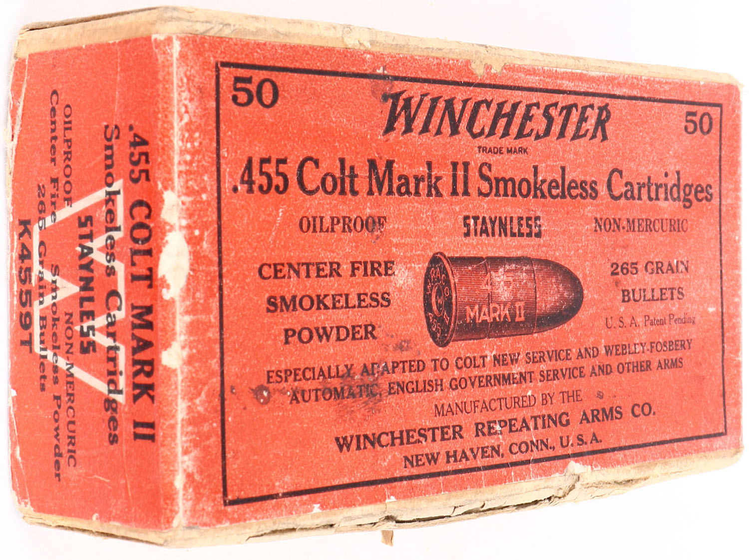 Winchester, Staynless, .455 Colt Mark II, 265 Grain Bullets, Full, 2pc. Buff box with orange wraparound label, box is solid with very good color, age soiling, some shelf wear, minor edge & corner wear, partial seam split to top front edge, tray of box is covered in tape, lid has tape on all sides and ends, label is intact, ammo is very good. Grade: Very Good + - Value: 50 to 300