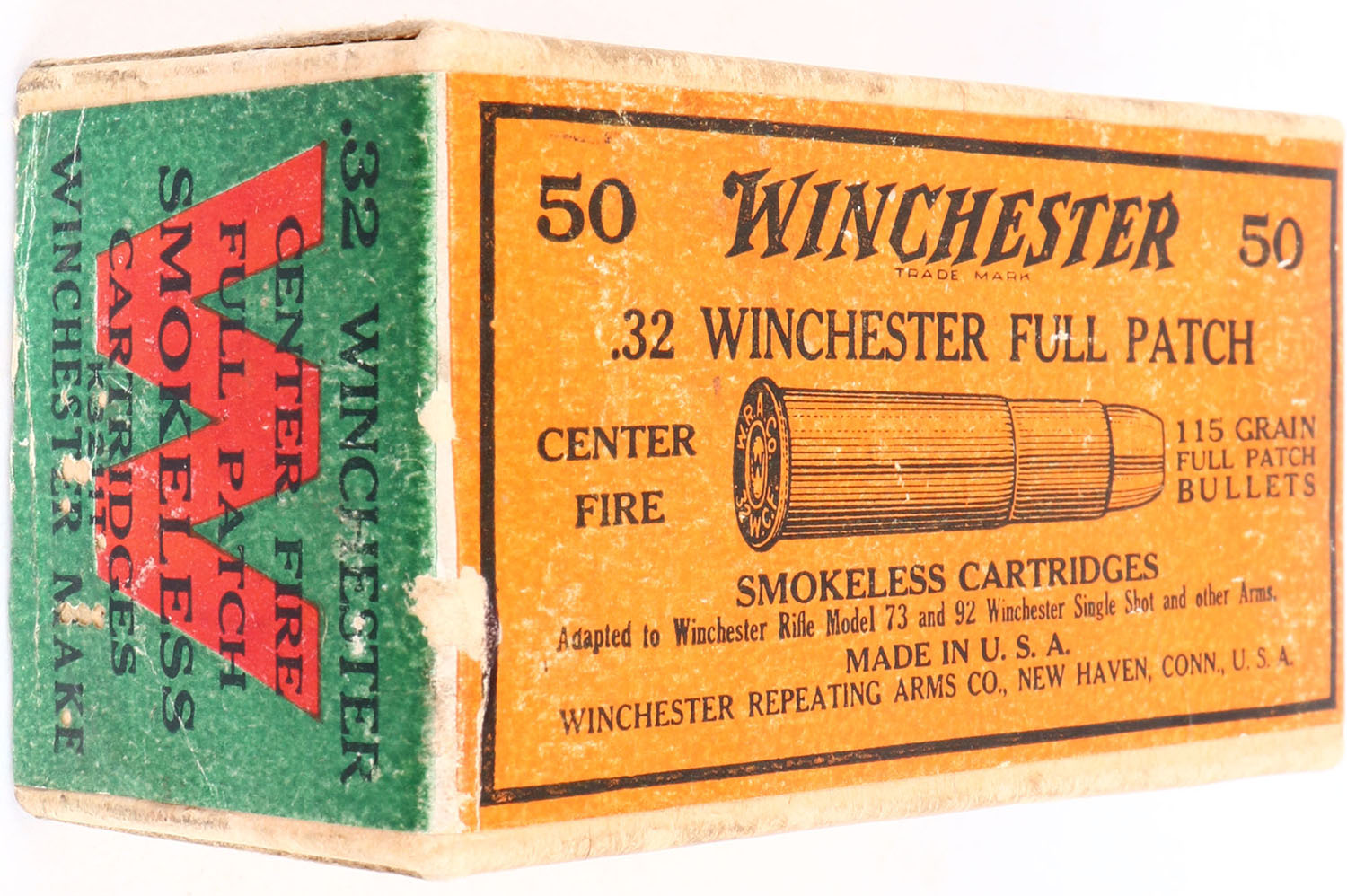 Winchester, .32 Winchester, Smokeless Cartridges, 115 Grain Full Patch Bullets, Full, 2pc. Buff box with orange & green wraparound label, box is solid with excellent color, minor age soiling & shelf wear, very minor edge & corner wear, back side has been written on, label is intact, ammo is excellent. Grade: Excellent + - Value: 30 to 90