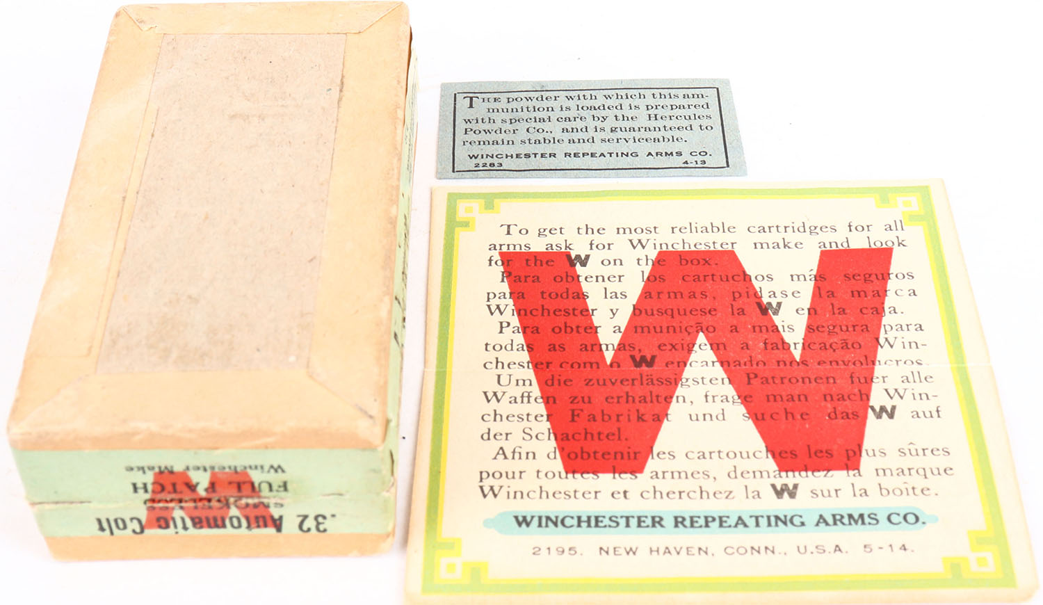 Winchester, .32 Automatic Colt, Smokeless Powder, 74 Grain Full Patch Bullets, Full with inserts, 2pc. Buff box with orange top & green side sealing labels, box is solid with very good to excellent color, minor age soiling & color fading, 2 vertical seam splits to left end of lid, minor edge & corner wear, labels are intact, inserts are excellent, ammo is excellent. Grade: Excellent - Value: 20 to 80