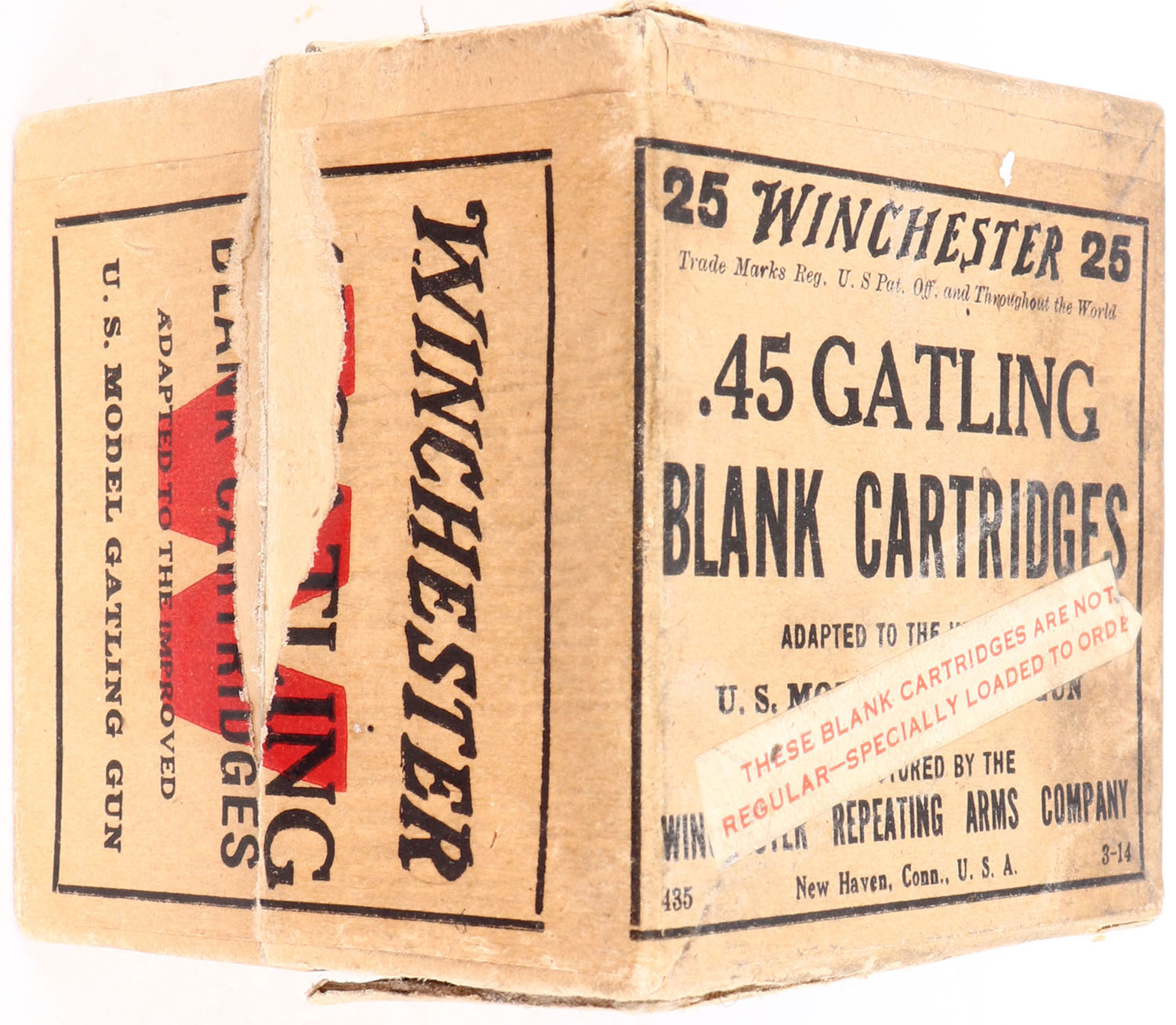 Winchester, .45 Gatling Blank Cartridges, Full, 2pc. Buff box with buff wraparound label & white over-label, box is solid with very good color, age soiling, vertical seam splits to 3 corners of lid, some edge & corner wear, label is 95% intact, ammo is very good to excellent. Grade: Very Good + - Value: 20 to 80
