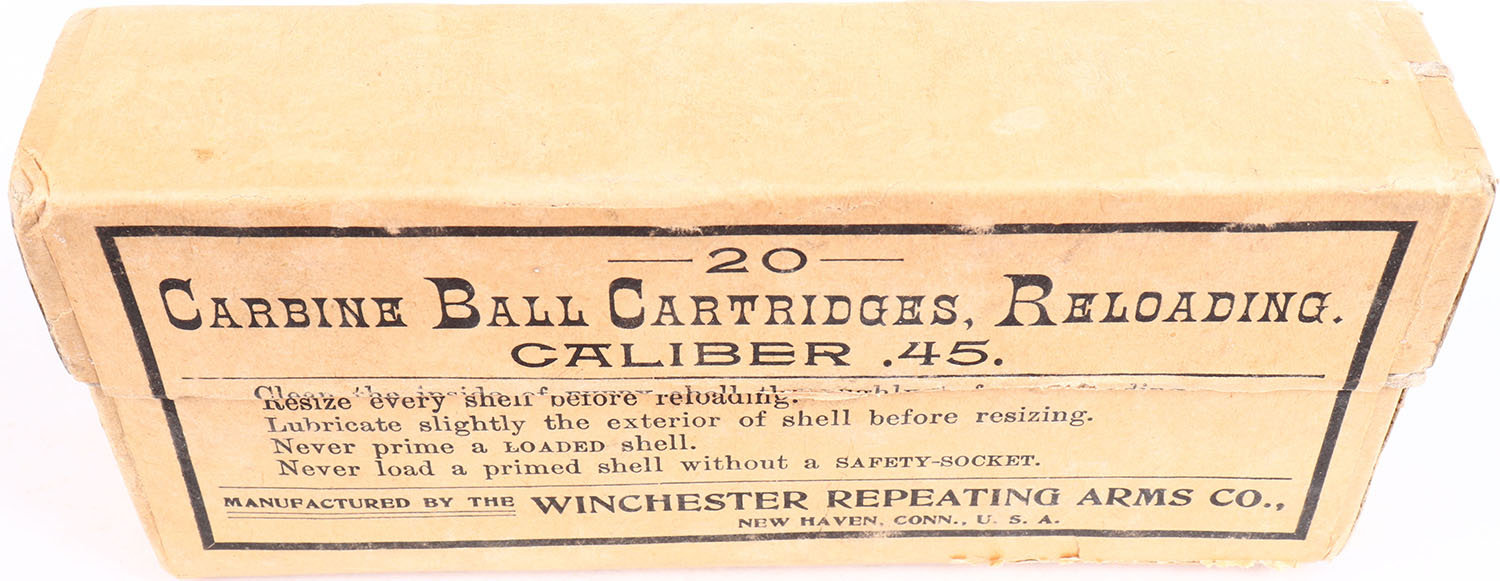 Winchester, Carbine Ball Cartridges, Reloading, .45 Caliber, Full, 2pc. Buff box with buff label, box is solid with excellent color, minor corner wear, edges are crisp, label & string are intact, ammo is excellent. Grade: Excellent + - Value: 50 to 150