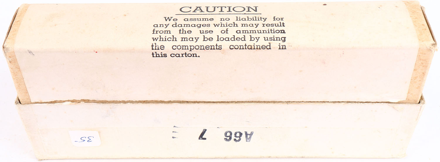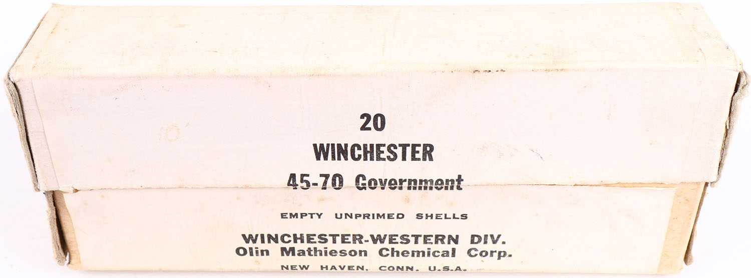 Winchester-Western, .45-70 Government, Empty Unprimed Shells, Full, 2pc. Buff box with white label, box is solid with very good to excellent color, some age soiling, minor edge & corner wear, label is intact, shells are excellent. Grade: Excellent + - Value: 10 to 40