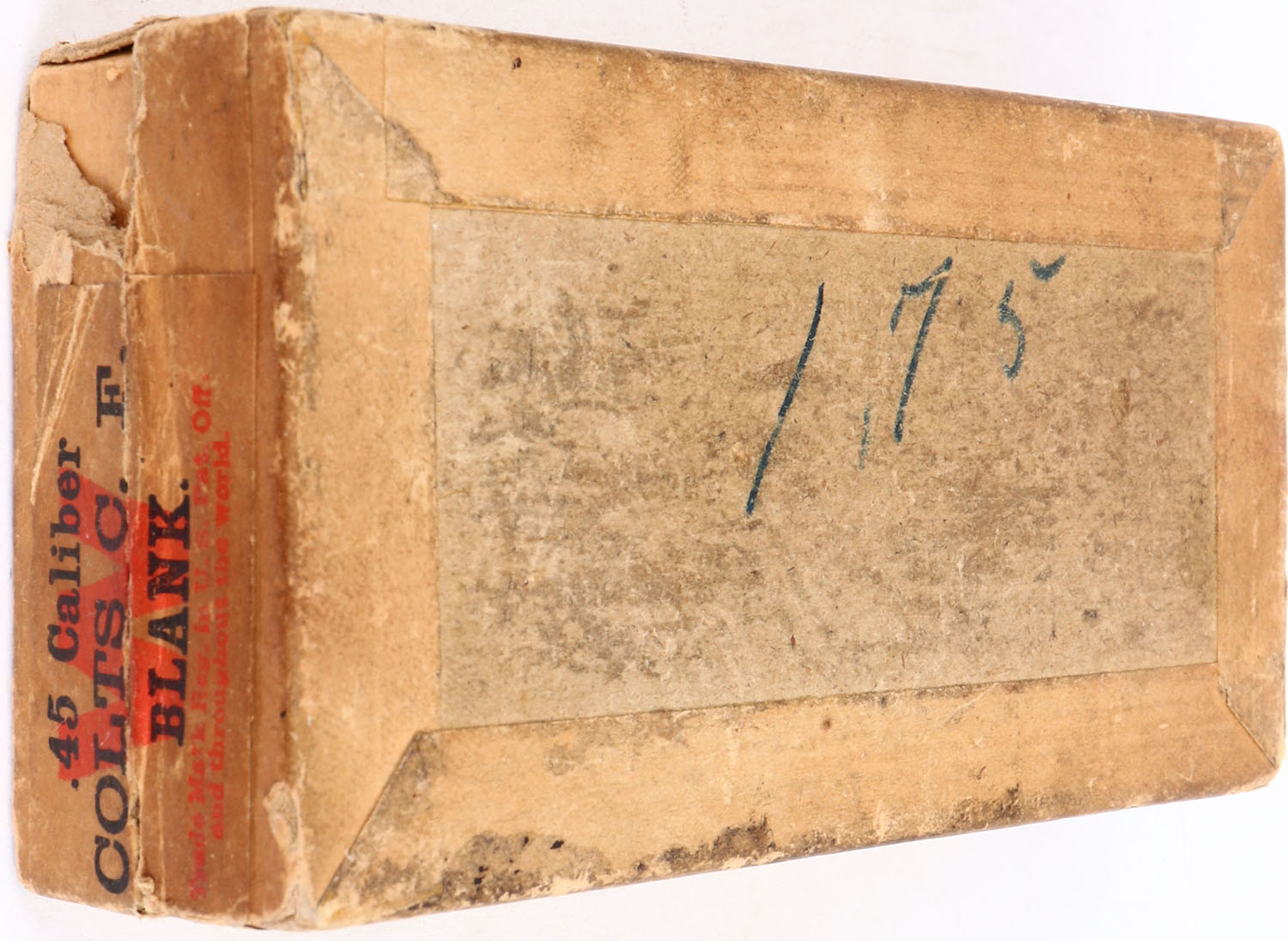Winchester, .45 Colt Blank, For Colt Revolvers, Full, 2pc. Buff box with buff top & side sealing labels, box is solid with very good color, age soiling, some edge & corner wear, bottom has been written on, ammo is very good to excellent. Grade: Excellent - Value: 20 to 80