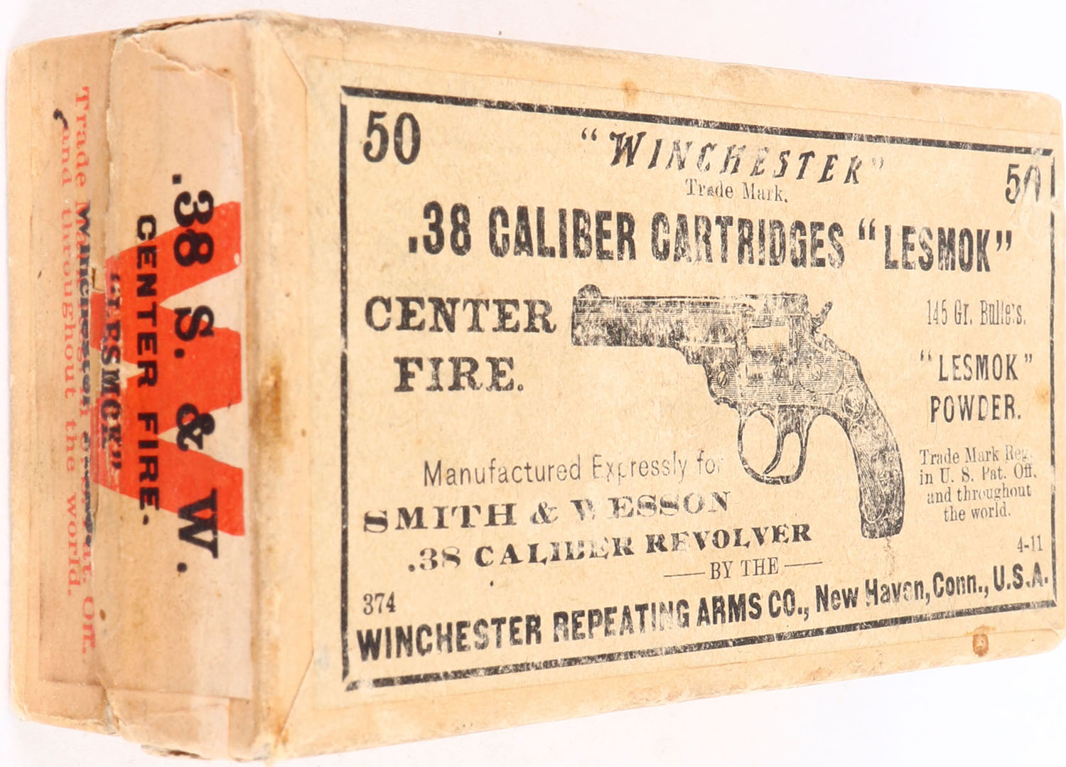 Winchester, .38 Caliber Cartridges, ''Lesmok'' Powder, 145 Gr. Bullets, Partial 35rds. 2pc. Buff box with buff top & side sealing labels, box is solid with very good to excellent color, some age soiling & shelf wear, vertical seam splits to all corners of lids, some edge & corner wear, labels are intact, ammo is very good. Grade: Very Good + - Value: 20 to 80