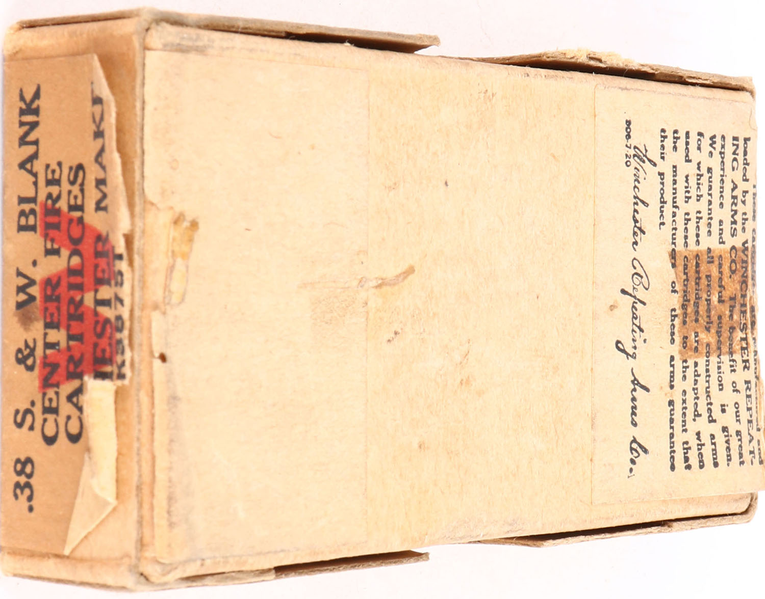 Winchester, .38 Smith & Wesson Center Fire Blank Cartridges, Partial 47rds. 2pc. Buff box with buff wraparound label, box is solid with excellent color, very minor age soiling & corner wear, front has been written on, labels are intact, ammo is excellent. (515) Grade: Excellent + - Value: 8 to 40