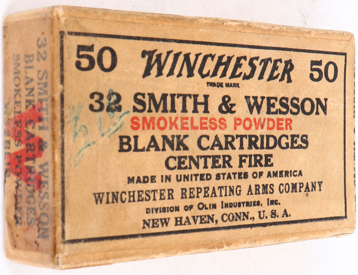 Winchester, .32 Smith & Wesson Blank Cartridges, Full, 2pc. Buff box with buff wraparound label, box is solid with excellent color, minor age soiling, very minor corner wear, some edge wear, all sides and ends are wrapped in tape on top and bottom of box, top has been written on, label is intact, ammo is excellent. Grade: Excellent - Value: 10 to 50