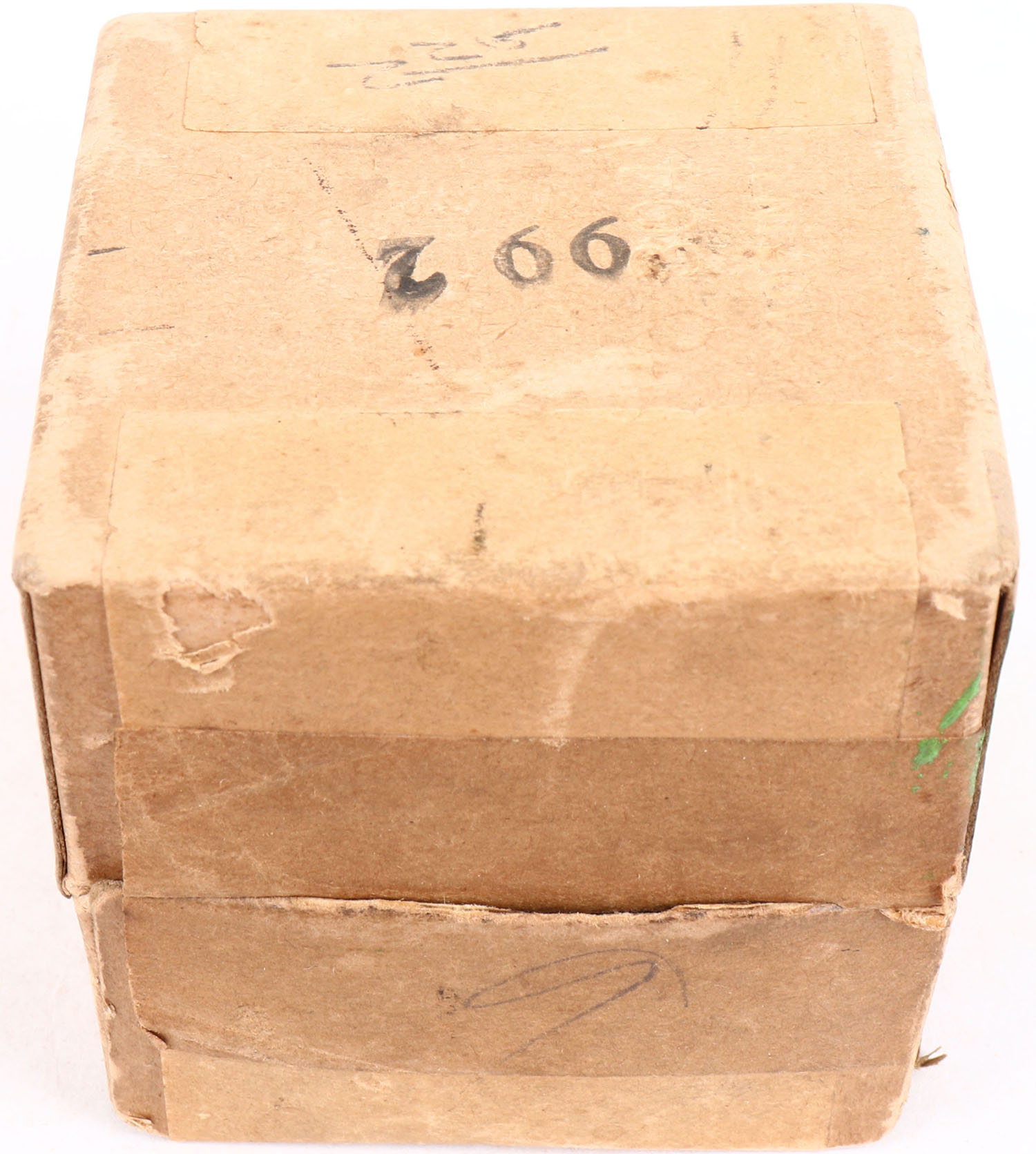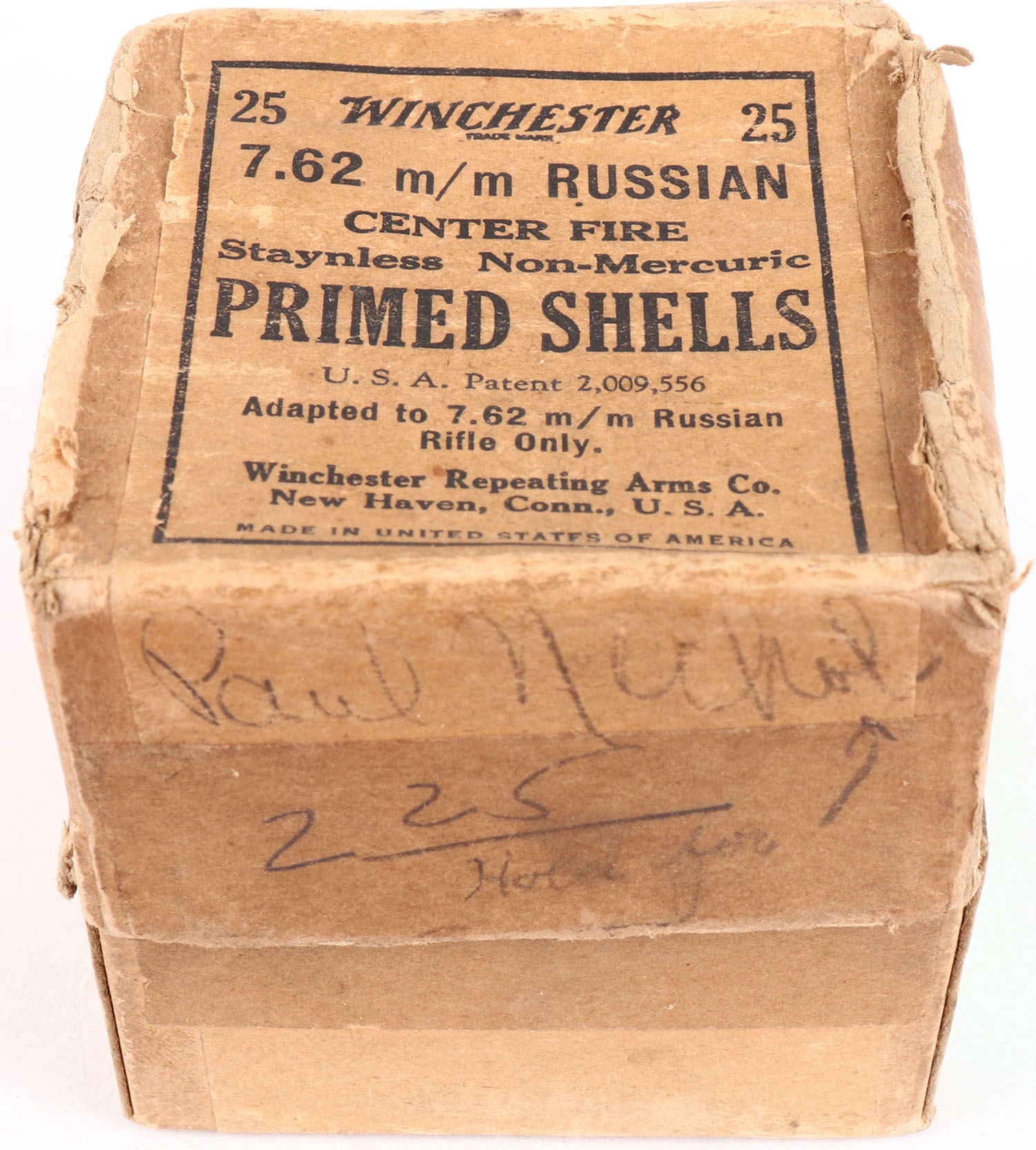 Winchester, Staynless, 7.62mm Russian, Primed Shells, Full, 2pc. Buff box with buff label, box is solid with very good color, age soiling, green tape on right end, edge & corner wear, front back and bottom have been written on, ammo is excellent. Grade: Very Good + - Value: 10 to 50