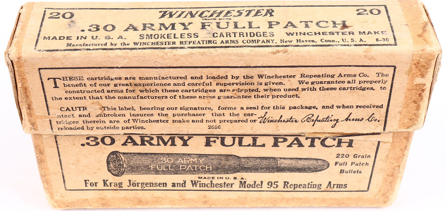 Winchester, .30 Army (.30-40 Krag) 220 Grain Ful Patch Bullets, Full, 2pc. Buff box with buff labels, box is solid with very good to excellent color, some age soiling, some edge & corner wear, back has been written on, labels are intact, ammo is excellent. Grade: Excellent - Value: 30 to 60