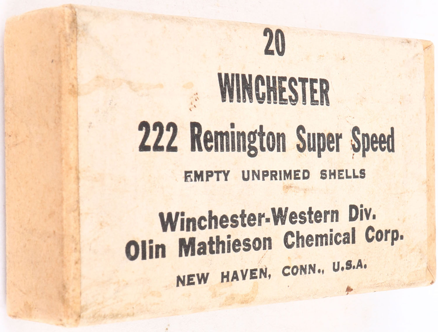 Winchester-Western, .222 Remington Super Speed, Empty Unprimed Shells, FULL & SEALED, 2pc. Buff box with white wraparound label, box is solid with very good color, some age soiling, very minor corner wear, edges are crisp, label is intact. Grade: Excellent + - Value: 10 to 50