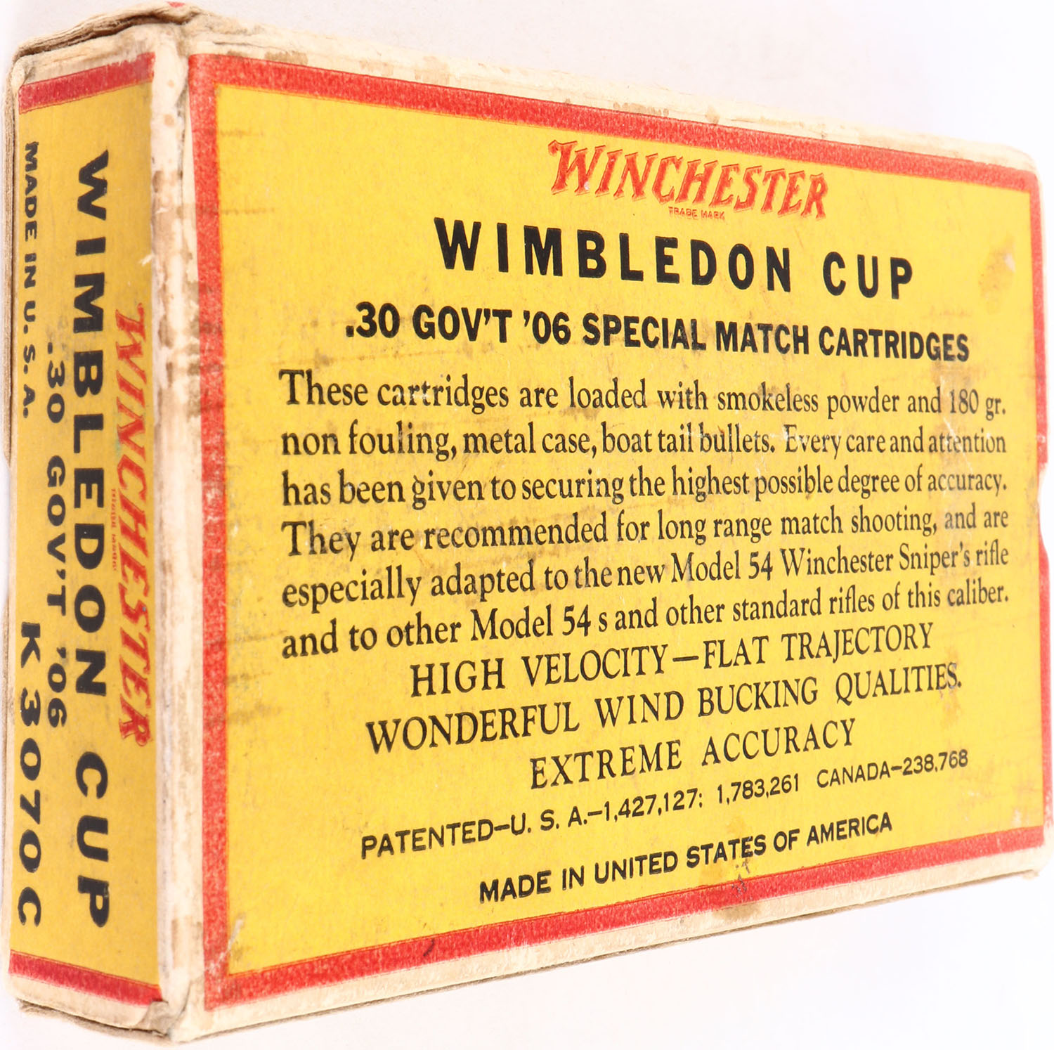 Winchester, Wimbledon Cup Special Match Cartridges, .30 Gov't '06, 180 Grain Kopperklad Full Patch Boat Tail Bullet, For Single Loading Only, Full, 1pc. Red yellow & black box, box is solid with very good to excellent color, minor age soiling, very some edge wear, corner wear, end flaps are solid, ammo is excellent. Grade: Excellent + - Value: 100 to 300