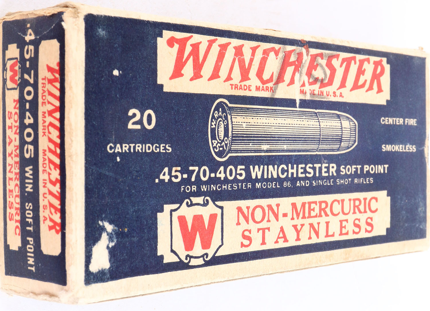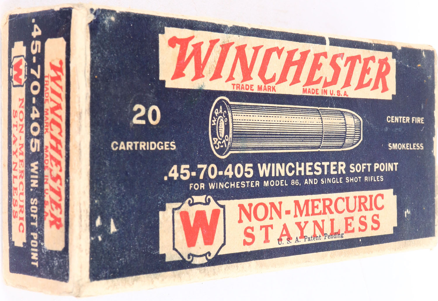 Winchester, Non-Mercuric Staynless, .45-70-405 Winchester, Soft Point, Full, 1pc. Blue white & red box, box is solid with very good color, some age soiling & shelf wear, minor edge & corner wear, end flaps are solid, bottom has been written on, ammo is very good to excellent. Grade: Excellent - Value: 100 to 300