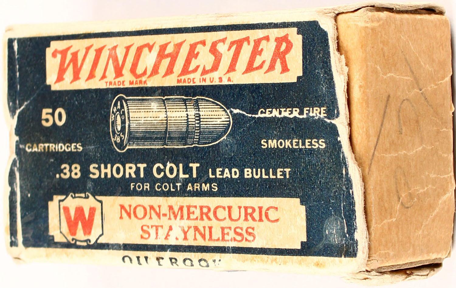 Winchester, Non-Mercuric Staynless, .38 Short Colt, Partial 16rds. 1pc. Blue white & red box, box is missing both end flaps, tear in top, age soiling corner wear, edge wear, shelf wear, ammo is excellent. Grade: Good - Value: 6 to 30