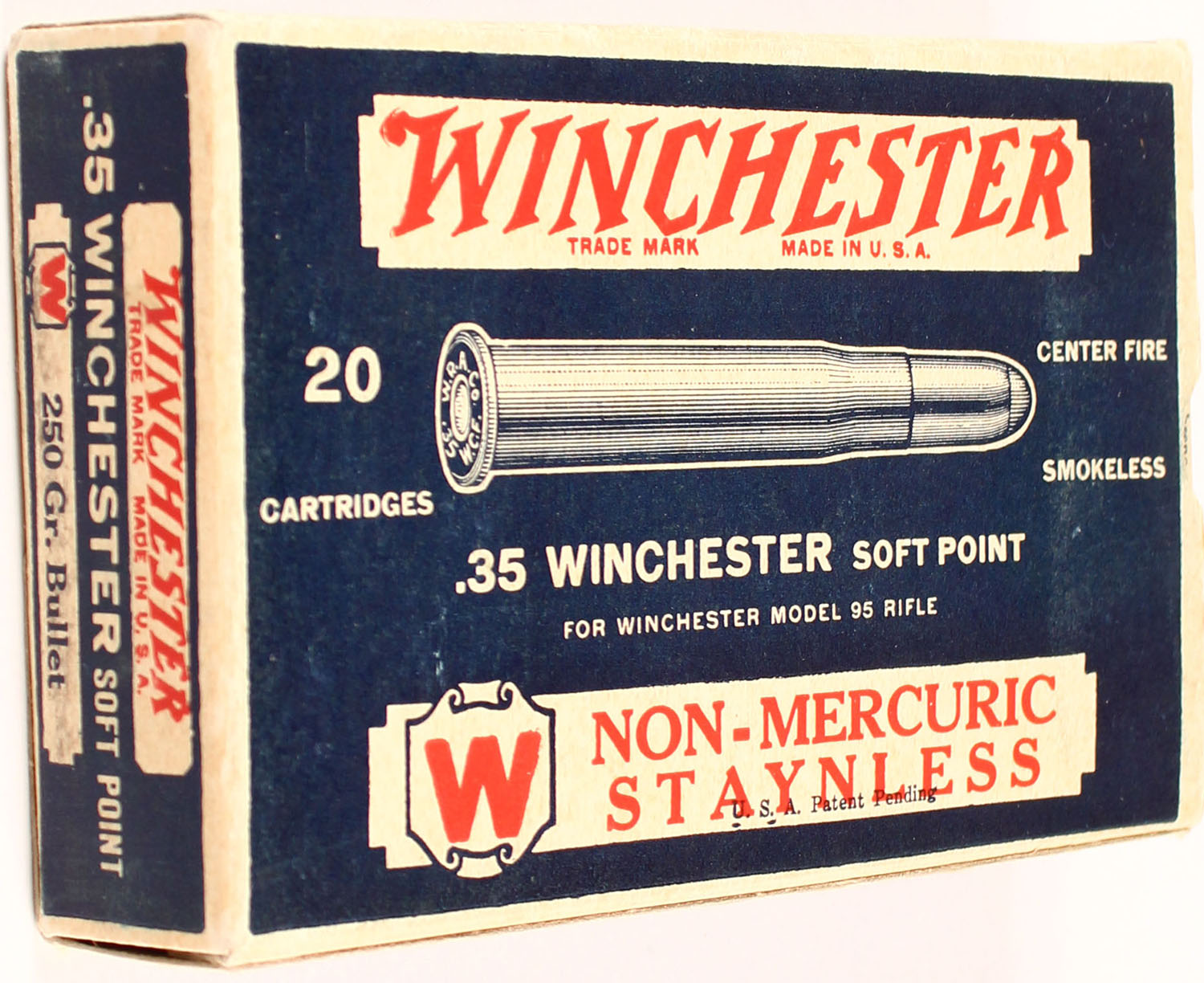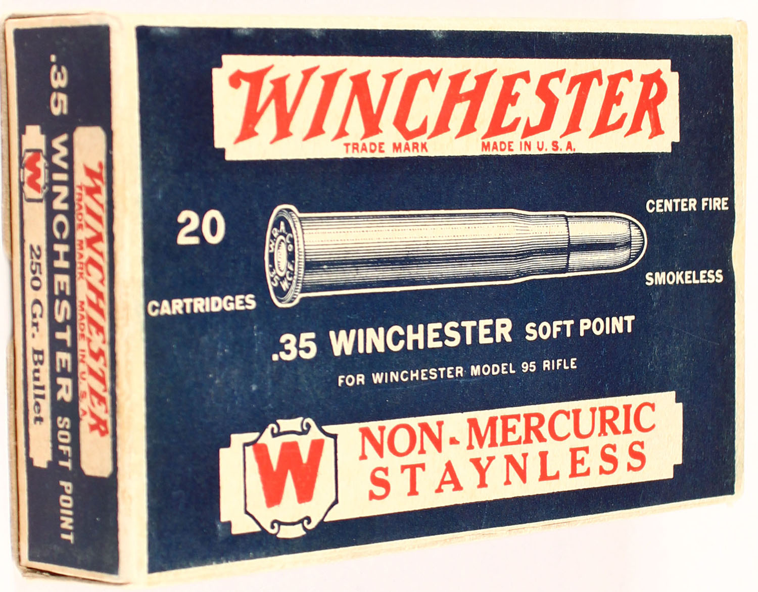 Winchester, Non-Mercuric Staynless, .35 Winchester, 250 Grain Soft Point Bullet, Full, 1pc. Blue white & red box, box is solid with excellent to minty color, very minor shelf & corner wear, edges are crisp, end flaps are solid, ammo is excellent. Grade: Excellent ++ - Value: 60 to 120