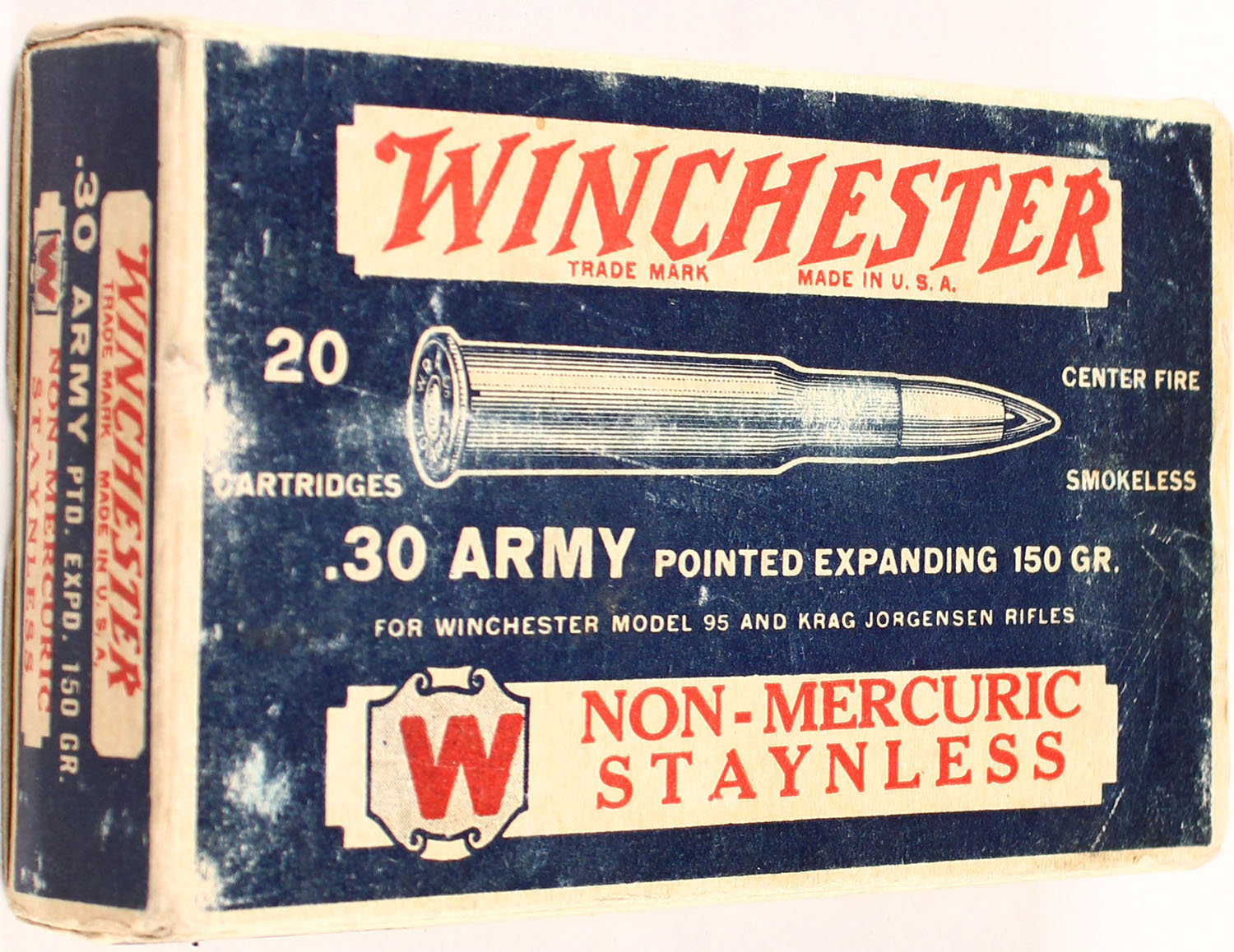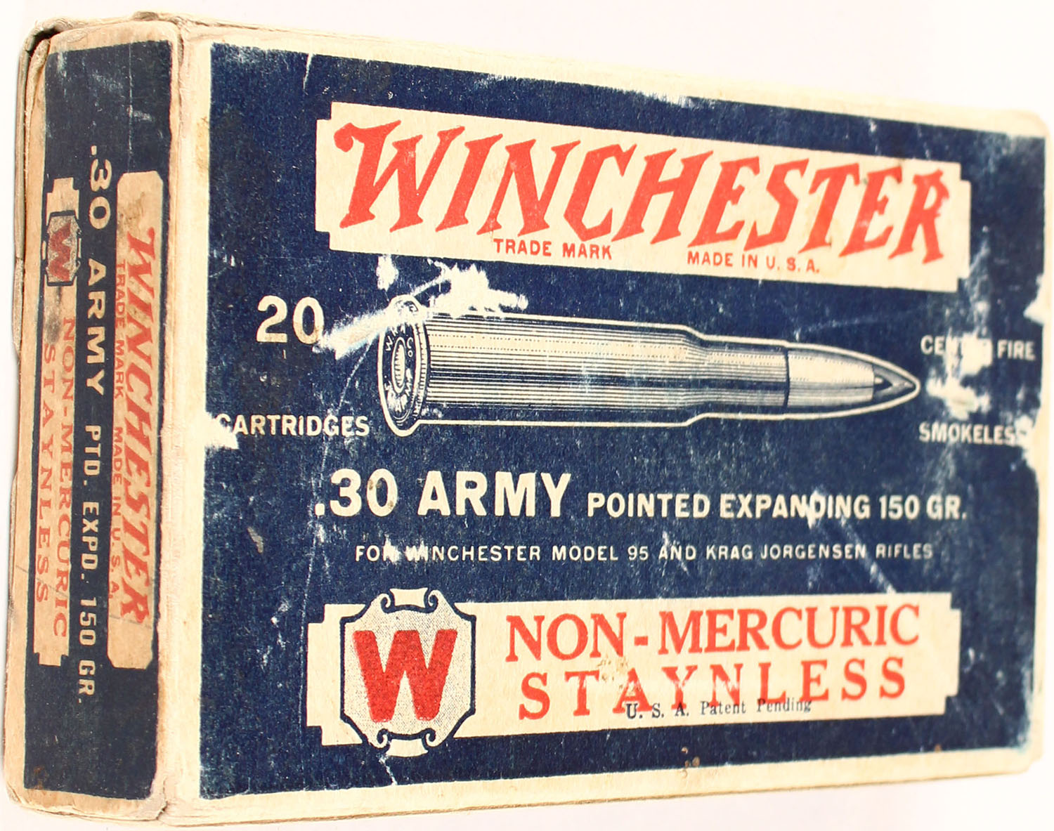 Winchester, Non-Mercuric Staynless, .30 Army (.30-40 Krag), 150 Gr. Pointed Expanding, Full, 1pc. Blue white & red box, box is solid with excellent color, some shelf wear, minor corner wear, end flaps are solid, ammo is excellent. Grade: Excellent - Value: 50 to 100