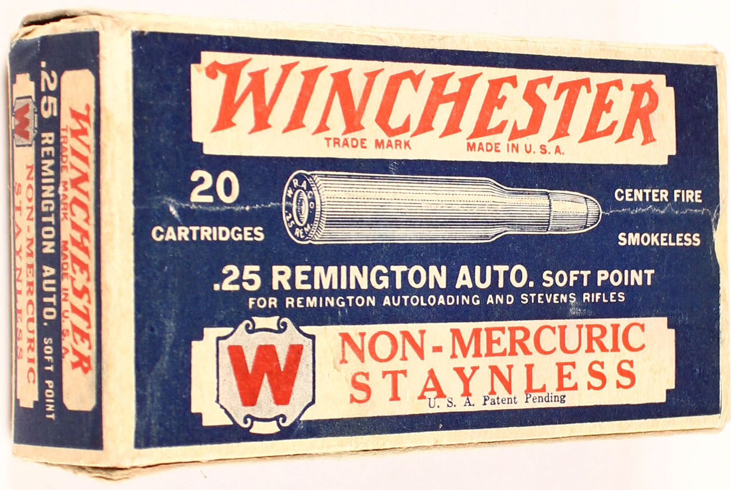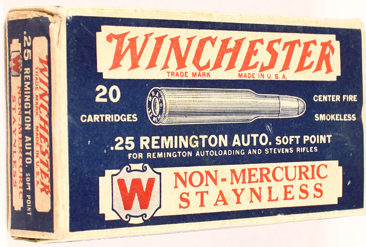 Winchester, Non-Mercuric Staynless, .25 Remington Auto., Full of mixed H/S, 1pc. Blue white & red box, box is solid with excellent color, only very minor age soiling, crease on back side of box, minor corner wear, edges are mostly crisp, end flaps are solid, ammo is excellent. Grade: Excellent + - Value: 40 to 120