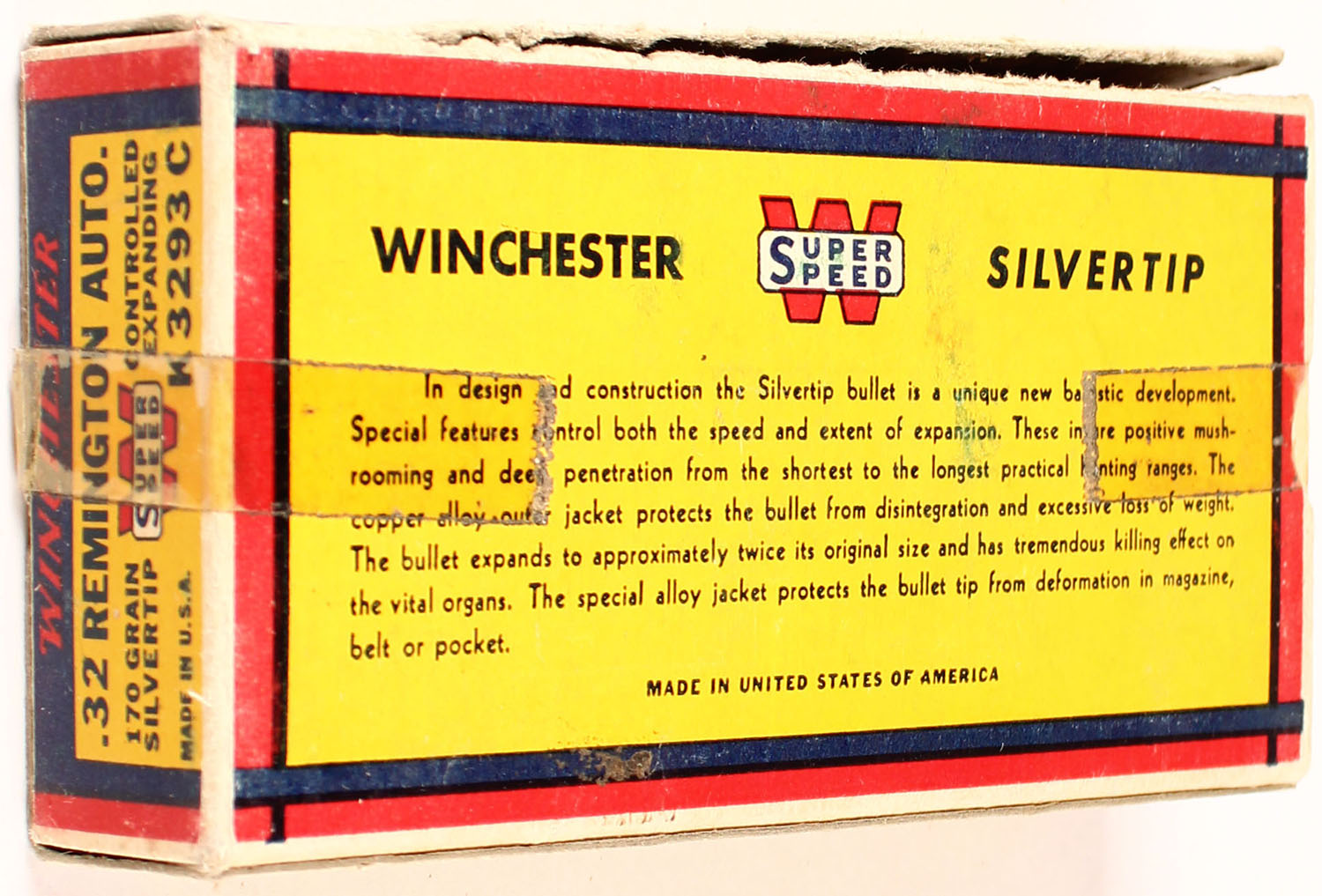 Winchester, Silvertip, .32 Remington Autoloading, 170 Grain Controlled Expanding Bullet, Full, 1pc. Yellow blue & red bear box, box is solid with excellent color, very minor age soiling, tape on both ends, partial seam split on top back edge, top has been written on, minor edge & corner wear, end flaps are solid, ammo is excellent. Grade: Very Good - Value: 20 to 80