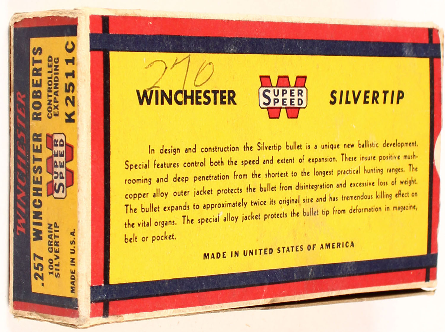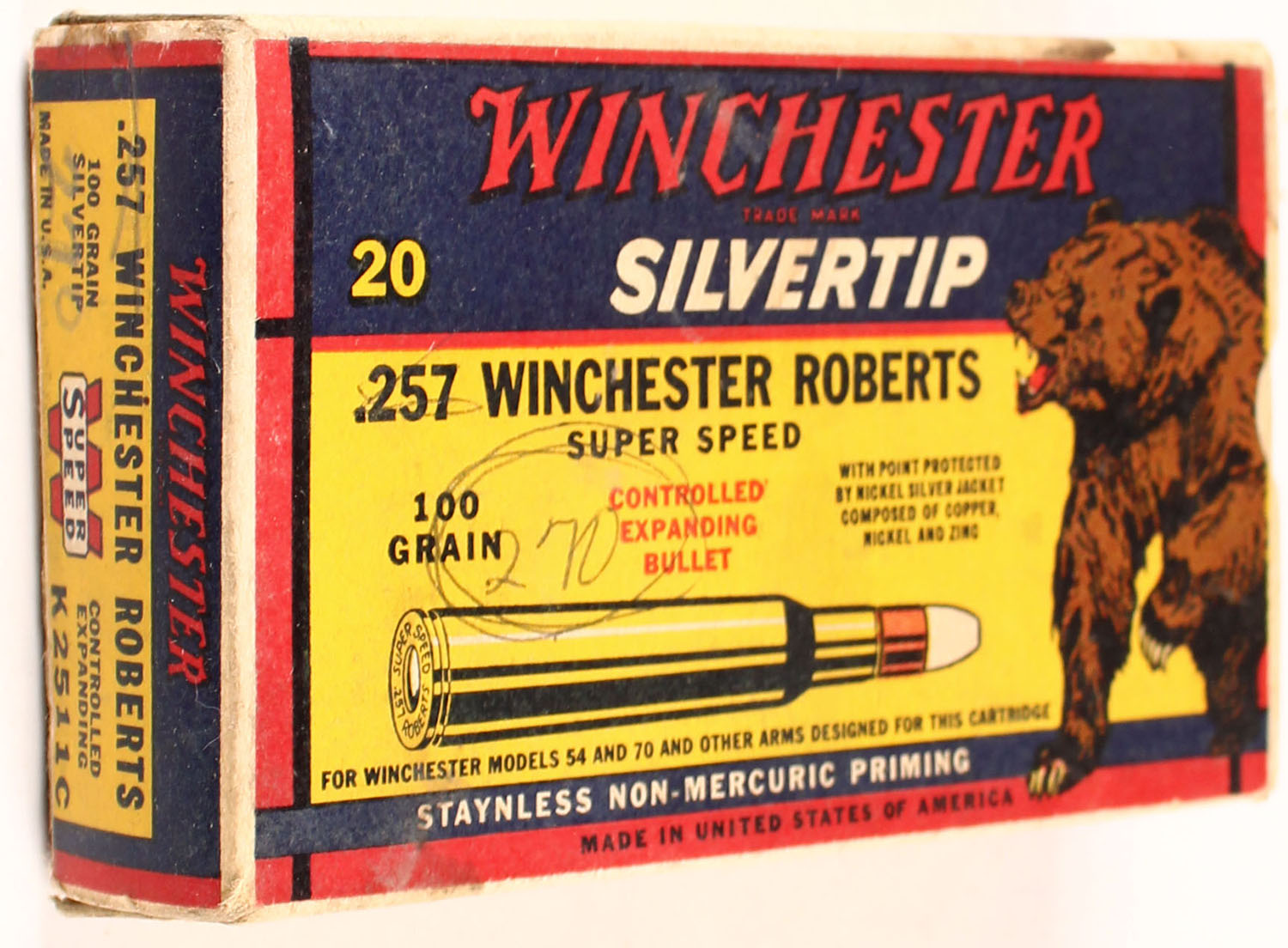 Winchester, Silvertip, .257 Winchester Roberts, 100 Grain Controlled Expanding Bullet, Empty, 1pc. Yellow blue & red bear box, box is solid with very good to excellent color, very minor age soiling, some staining, top has been written on, minor corner wear, edges are mostly crisp, end flaps are solid. Grade: Excellent - Value: 8 to 40