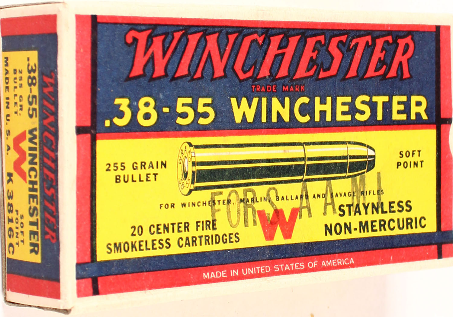 Winchester, Super Speed, .38-55 Winchester, 255 Grain Soft Point Bullet, Full, 1pc. Yellow blue & red box with FOR SAAMI over-stamp, box is solid with excellent color, very minor shelf wear, corners are sharp, edges are crisp, end flaps are solid, ammo is good. Grade: Excellent ++ - Value: 40 to 120