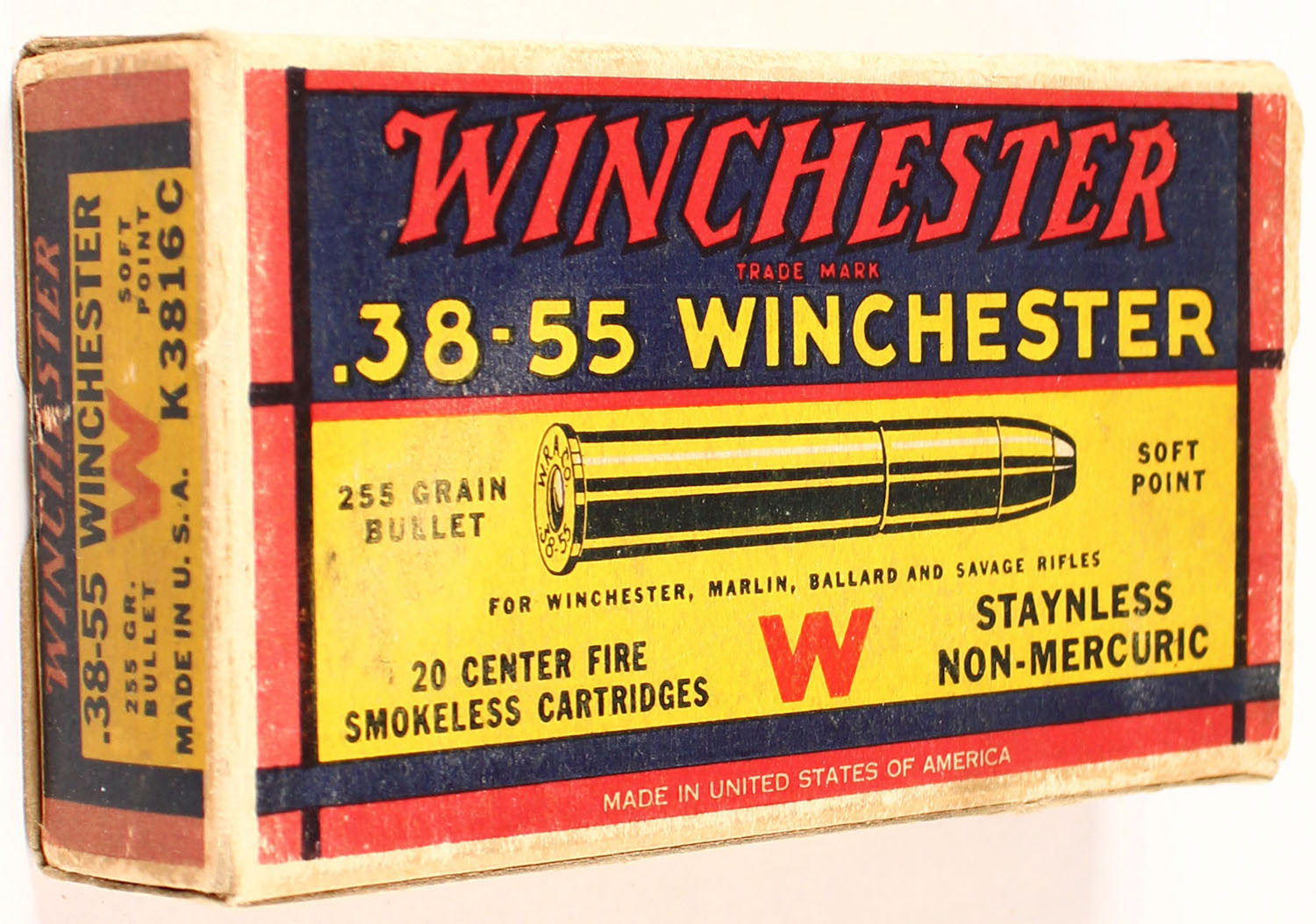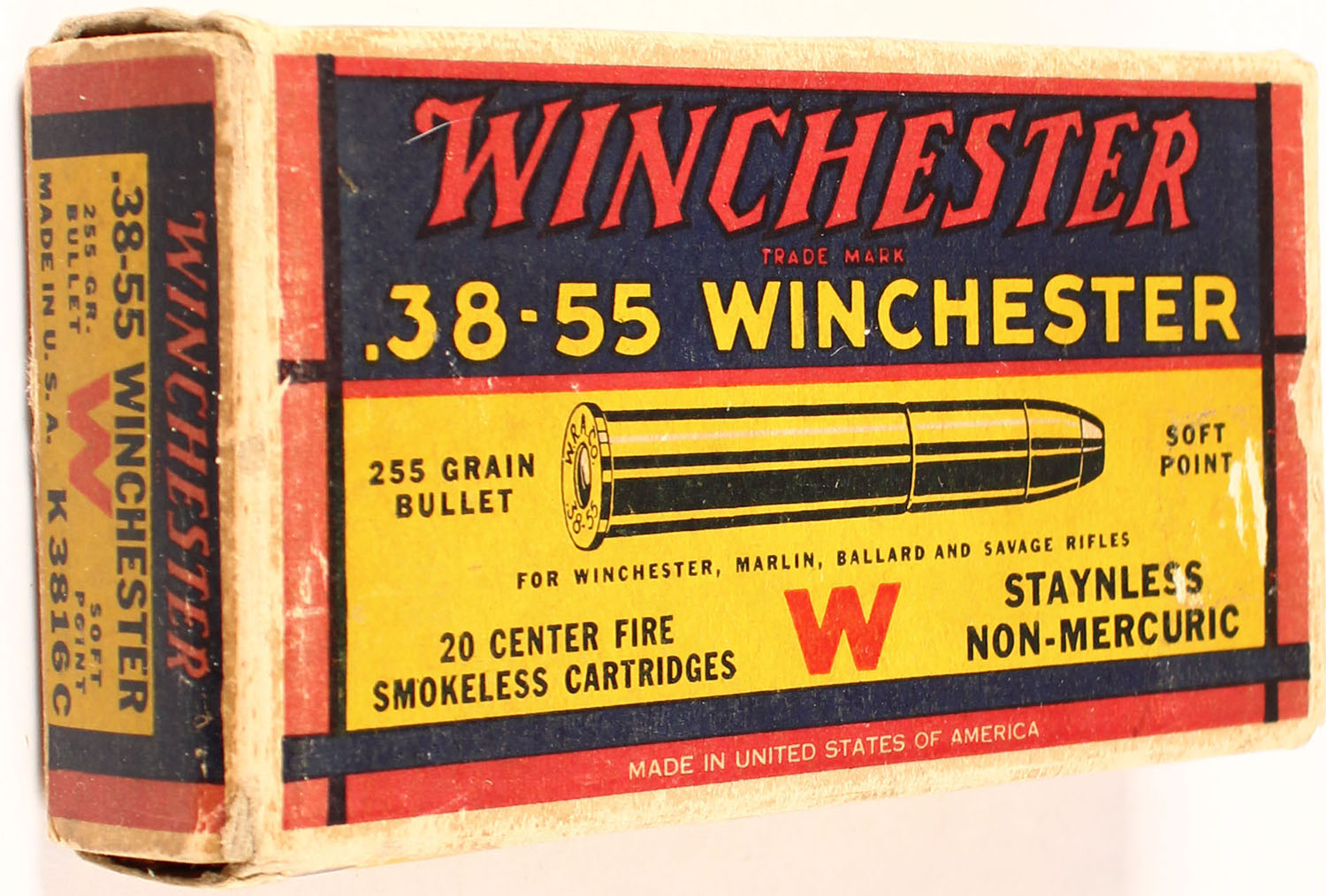Winchester, Super Speed, .38-55 Winchester, 255 Grain Soft Point Bullet, Full, 1pc. Yellow blue & red box, box is solid with very good color, age soiling, very minor shelf wear, some edge & corner wear, end flaps are solid, ammo is excellent. Grade: Excellent - Value: 40 to 120