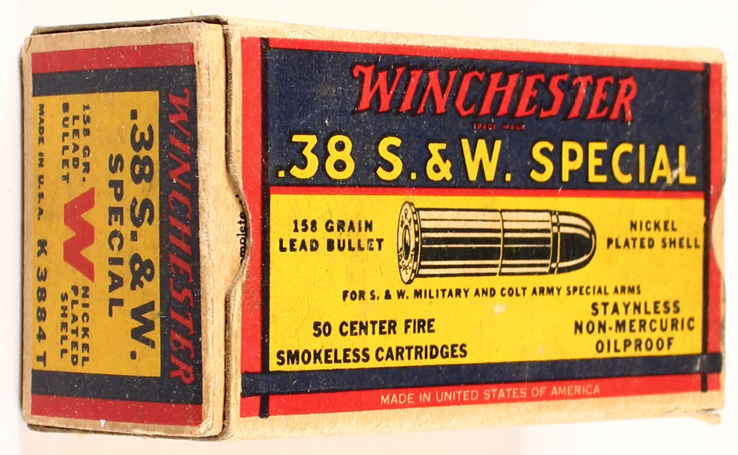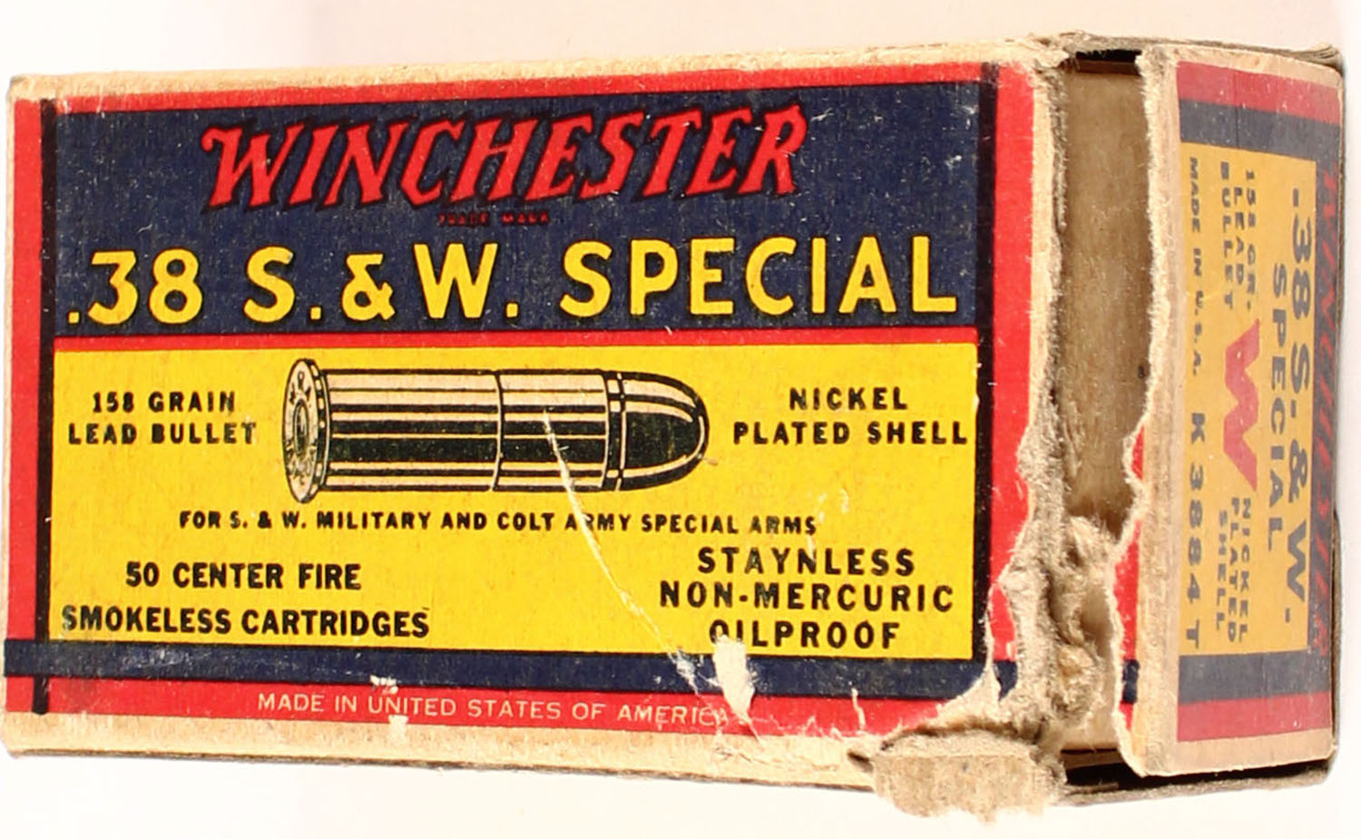 Winchester, Super Speed, .38 Smith & Wesson Special, 158 Grain Lead Bullet, Nickel Plated Shell, Full, 1pc. Yellow blue & red box, right end flap is torn off, box has very good color, some age soiling, minor edge & corner wear, left end flap is solid, ammo is excellent. Grade: Very Good + - Value: 20 to 60