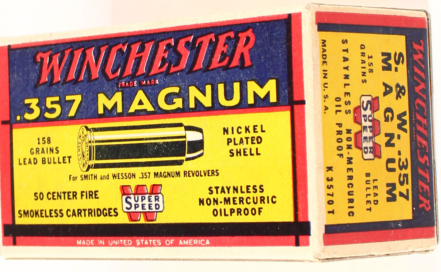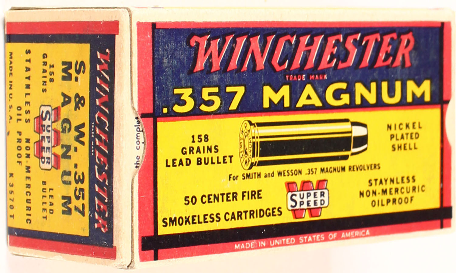 Winchester, Super Speed, .357 Magnum, 158 Grain Lead Bullet, Nickel Plated Steel, Full, 1pc. Yellow blue & red box, box is solid with excellent color, only very minor age soiling & shelf wear, corners are mostly sharp, edges are crisp, end flaps are solid, ammo is excellent. Grade: Excellent ++ - Value: 50 to 300