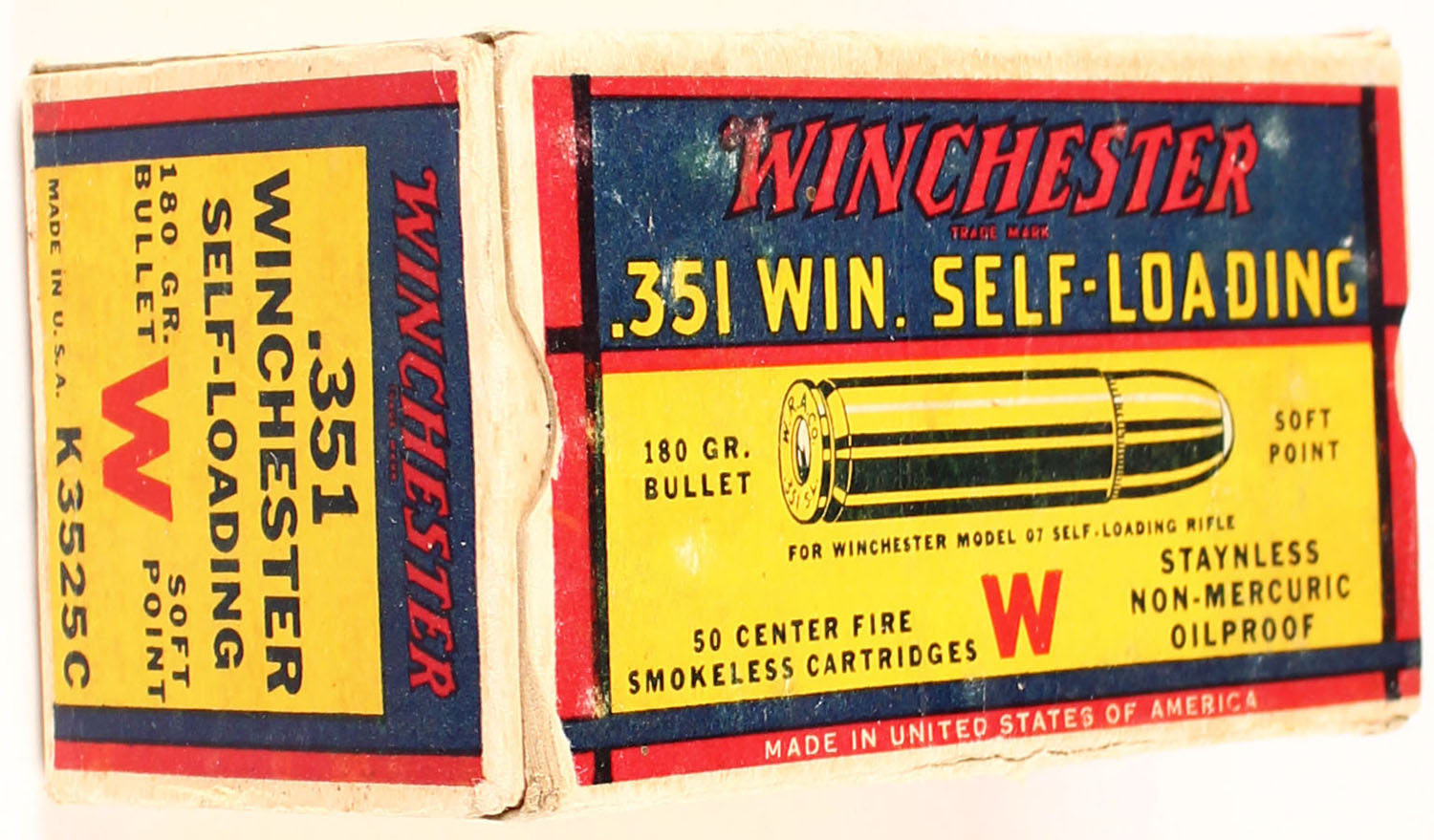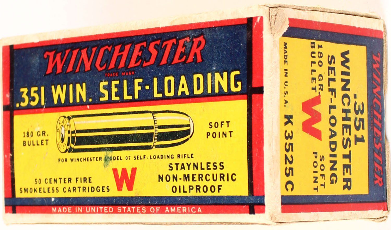 Winchester, Super Speed, .351 Winchester Self Loading, 180 Grain Soft Point Bullet, Full, 1pc. Yellow red & blue box, box is solid with excellent color, only very minor age soiling & shelf wear, very minor corner wear, partial seam split to top front edge, edges are otherwise mostly crisp, end flaps are solid, ammo is very good to excellent. Grade: Excellent - Value: 100 to 300