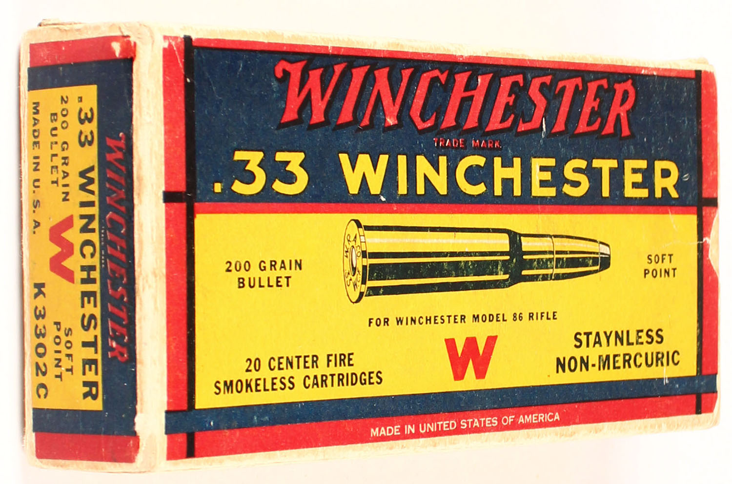 Winchester, .33 Winchester, 200 Grain Soft Point Bullet, Full of Mixed Ammo, 1pc. Yellow blue & red box, box is solid with excellent color, minor age soiling & corner wear, very minor edge wear, bottom has been written on, end flaps are solid, ammo is excellent. Grade: Excellent + - Value: 30 to 90
