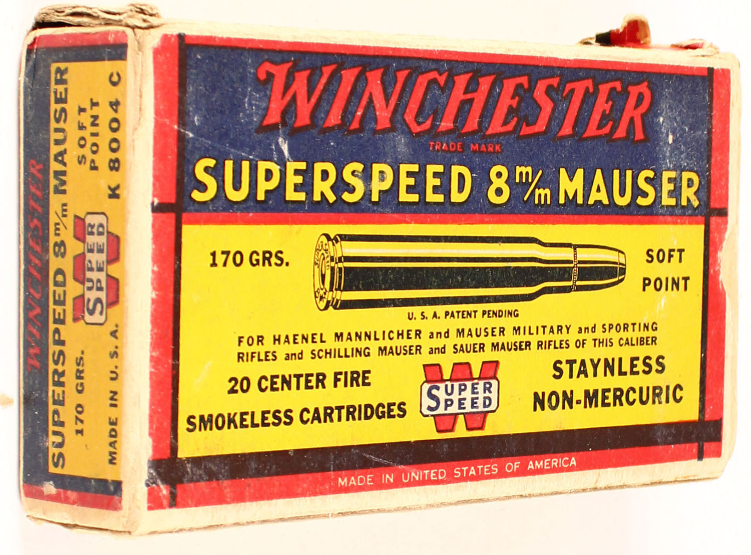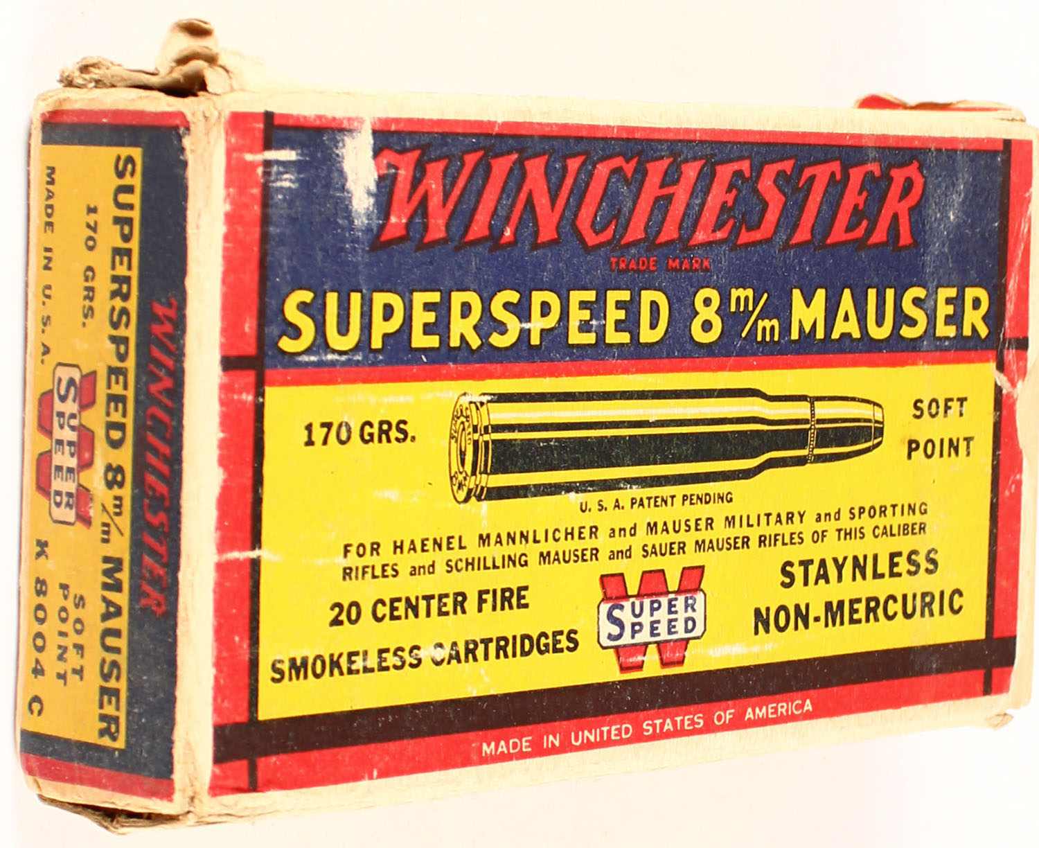 Winchester, Super Speed, 8mm Mauser, 170 Grain Soft Point, Full, 1pc. Yellow blue & red box, box is solid with very good to excellent color, minor age soiling & shelf wear, corner wear, minor edge wear, end flaps are solid, ammo is excellent. Grade: Excellent - Value: 30 to 90