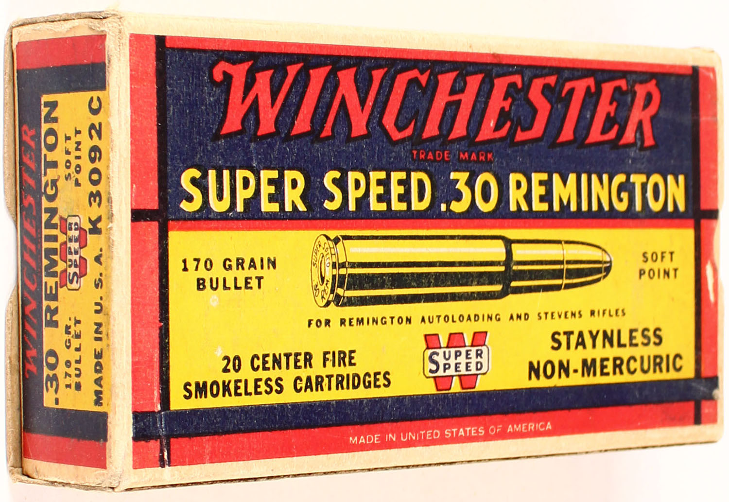 Winchester, Super Speed, .30 Remington, 170 Grain Soft Point Bullet, Full, 1pc. Yellow blue & red box, box is solid with very good to excellent color, some age soiling, small stain on top left end, very minor corner wear, edges are mostly crisp, front has been written on, end flaps are solid, ammo is excellent. Grade: Excellent + - Value: 50 to 150